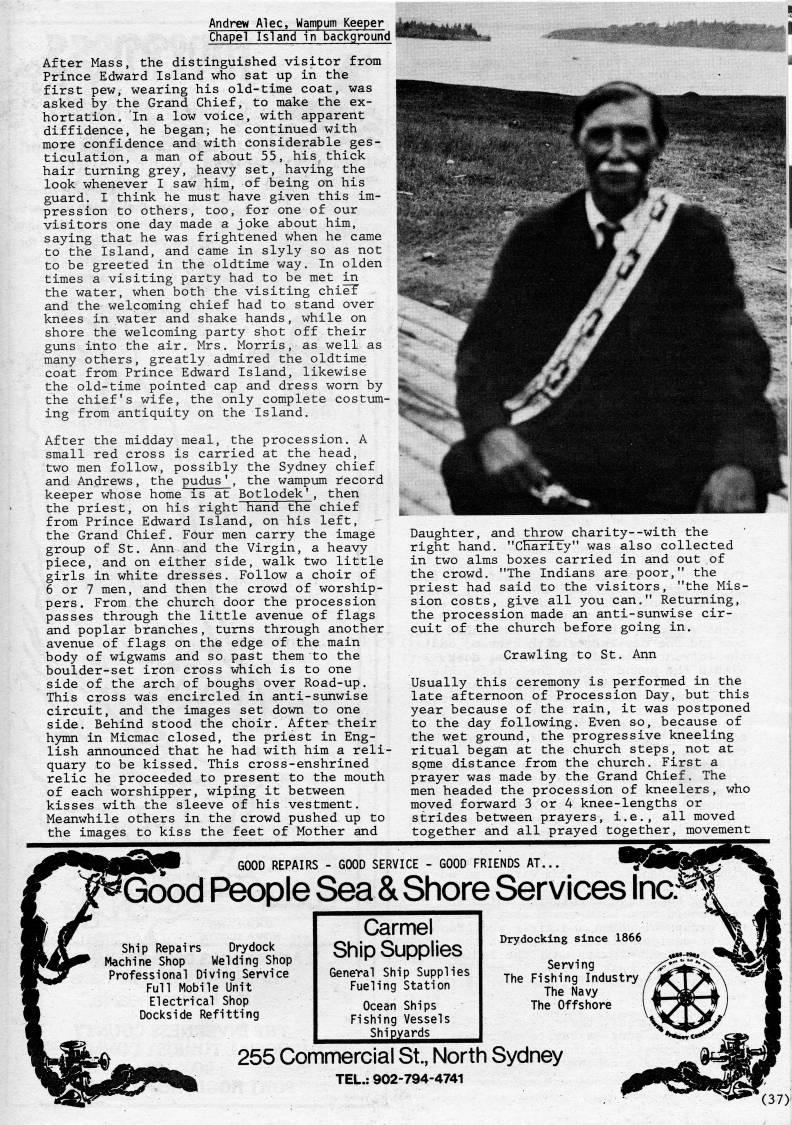 Published by Ronald Caplan on 1985/8/1 (370 reads)Andrew Alec, Wampum Keeper Chapel Island in background After Mass, the distinguished visitor from Prince Edward Island who sat up in the first pew, wearing his old-time coat, was asked by the Grand Chief, to make the ex? hortation. In a low voice, with apparent diffidence, he began; he continued with more confidence and with considerable ges? ticulation, a man of about 55, his thick hair turning grey, heavy set, having the look whenever I saw him, of being on his guard. I think he must have given this im? pression to others, too, for one of our visitors one day made a joke about him, saying that he was frightened when he came to the Island, and came in slyly so as not to be greeted in the oldtime way. In olden times a visiting party had to be met in the water, when both the visiting chieT and the welcoming chief had to stand over knees in water and shake hands, while on shore the welcoming party shot off their guns into the air. Mrs. Morris, as well as many others, greatly admired the oldtime coat from Prince Edward Island, likewise the old-time pointed cap and dress worn by the chief's wife, the only complete costimi- ing from antiquity on the Island. After the midday meal, the procession. A small red cross is carried at the head, two men follow, possibly the Sydney chief and Andrews, the pudus', the wampum record keeper whose home is at Botlodek', then the priest, on his right hand the chief from Prince Edward Island, on his left, the Grand Chief. Four men carry the image group of St. Ann and the Virgin, a heavy piece, and on either side, walk two little girls in white dresses. Follow a choir of 6 or 7 men, and then the crowd of worship? pers. From the church door the procession passes through the little avenue of flags and poplar branches, turns through another avenue of flags on the edge of the main body of wigwams and so past them to the boulder-set iron cross which is to one side of the arch of boughs over Road-up. This cross was encircled in anti-sunwise circuit, and the images set down to one side. Behind stood the choir. After their hymn in Micmac closed, the priest in Eng? lish announced that he had with him a reli? quary to be kissed. This cross-enshrined relic he proceeded to present to the mouth of each worshipper, wiping it between kisses with the sleeve of his vestment. Meanwhile others in the crowd pushed up to the images to kiss the feet of Mother and Daughter, and throw charity--with the right hand. "Charity" was also collected in two alms boxes carried in and out of the crowd. "The Indians are poor," the priest had said to the visitors, "the Mis? sion costs, give all you can." Returning, the procession made an anti-sunwise cir? cuit of the church before going in. Crawling to St. Ann Usually this ceremony is performed in the late afternoon of Procession Day, but this year because of the rain, it was postponed to the day following. Even so, because of the wet ground, the progressive kneeling ritual began at the church steps, not at some distance from the church. First a prayer was made by the Grand Chief. The men headed the procession of kneelers, who moved forward 3 or 4 knee-lengths or strides between prayers, i.e., all moved together and all prayed together, movement GOOD REPAIRS - GOOD SERVICE - GOOD FRIENDS AT... Good People Sea & Shore Services Inc Ship Repairs Drydock Machine Shop Welding Shop Professional Diving Service Full Mobile Unit Electrical Shop Dockside Refitting Carmel Ship Supplies General Ship Supplies Fueling Station Ocean Ships Fishing Vessels 'hijg'''ard' Drydocklng since 1866 Serving The Fishing Industry The Navy The Offshore 255 Commercial St., North Sydney TEL.: 902-794-4741 (37)
