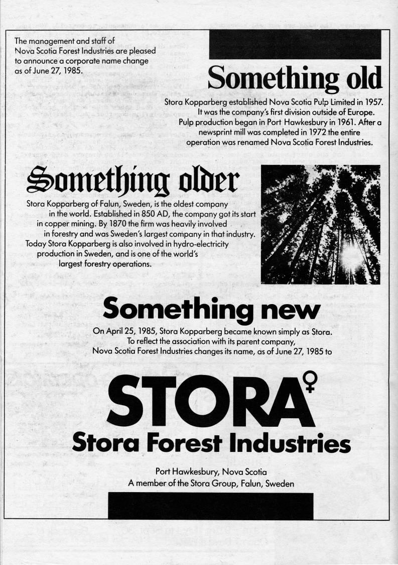 Published by Ronald Caplan on 1985/8/1 (432 reads)The management and staff of Nova Scotia Forest Industries are pleased to announce a corporate name change asofJune27J985. Something old Stora Kopparberg established Nova Scotia Pulp Limited in 1957. It was the company's first division outside of Europe. Pulp production began in Port Hawkesbury in 1961. After a newsprint mill was completed in 1972 the entire operation was renamed Nova Scotia Forest Industries. ometjims ote Stora Kopparberg of Falun, Sweden, is the oldest company in the world. Established in 850 AD, the company got its start in copper mining. By 1870 the firm was heavily involved in forestry and was Sweden's largest company in that industry. Today Stora Kopparberg is also involved in hydro-electricity production in Sweden, and is one of the world's largest forestry operations. Something ne''f On April 25,1985, Stora Kopparberg became known simply as Stora. To reflect the association with its parent company. Nova Scotia Forest Industries changes its name, as of June 27,1985 to STORA' Stora Forest Industries Port Hawkesbury, Nova Scotia A member of the Stora Group, Falun, Sweden