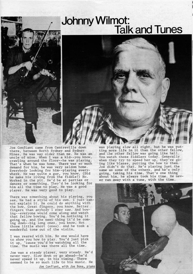 r Johnny Wilmot: p Talk and Tunes Joe.Confiant came from Centreville down there, between North Sydney and Sydney Mines. He was way older than me. He was an uncle of mine. When I was a kid--you know, crawling around the floor--he was playing. That's when he was home. There was so much demand for him, he was very seldom home. Everybody looking for him--playing every? where. He was quite a guy, you know. (Did he make his living from the fiddle?) No. Worked in the pit. He'd be at parties or dances or something. They'd be looking for him all the time to play. He was a good player. He was very good to play. There was something about his playing, you see. He had a style of his own. I just can? not explain it. He could do anything with the bow. Great fingers, you know. Better fingers than anybody I ever saw. And bow? ing- -everyone would come along and watch that fellow bowing. You'd be noticing it going up, and the next thing it'd be com? ing down--big long ones, you know. Not those little short (ones). And he took a wonderful tone out of the violin. I was reared with him. No one would have to show you how to play. You'd just pick it up, 'cause you'd be watching all the time. The music was there all the time. Joe was a steady player, very steady. He'd never vary. Slow down or go ahead--he'd never speed it up, in his timing. There seemed to be so much life to his music. He Joe Confiant, with Joe Bona, piano was playing slow all right, but he was put? ting more life in it than the other fellow, and che other fellow was going like hell. You watch those fiddlers today. Generally when they try to speed her up, they're go? ing like blazes, putting the bow to them. Joe didn't do that. He's playing just the same as some of the others, and he's only going, taking his time. That's one thing about him, he always took his time. He nev? er ran away with a tune, with the time.