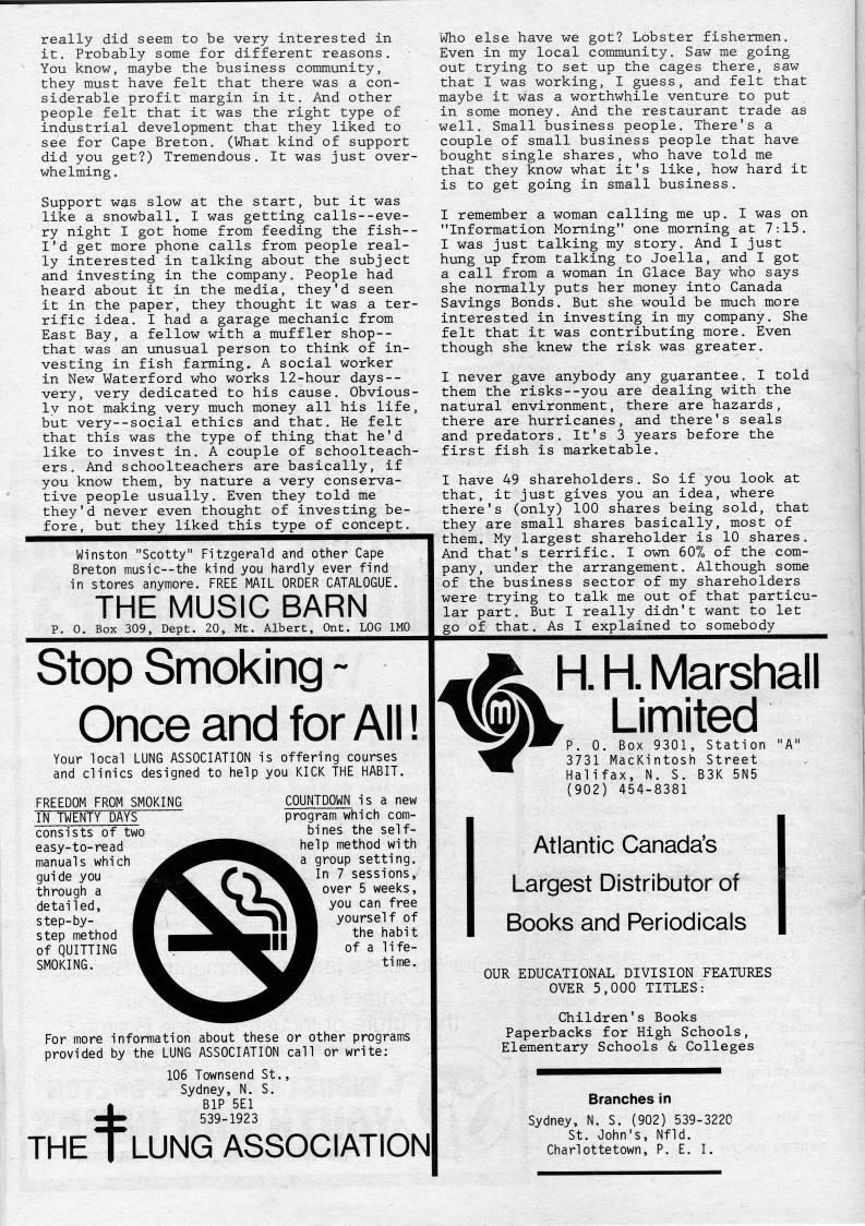 Published by Ronald Caplan on 1986/1/1 (278 reads)really did seem to be very interested in it. Probably some for different reasons. You know, maybe the business community, they must have felt that there was a con? siderable profit margin in it. And other people felt that it was the right type of industrial development that they liked to see for Cape Breton, (What kind of support did you get?) Tremendous. It was just over? whelming . Support was slow at the start, but it was like a snowball. I was getting calls--eve- ry night I got home from feeding the fish-- I'd get more phone calls from people real? ly interested in talking about the subject and investing in the company. People had heard about it in the media, they'd seen it in the paper, they thought it was a ter? rific idea. I had a garage mechanic from East Bay, a fellow with a muffler shop-- that was an unusual person to think of in? vesting in fish fanning, A social worker in New Waterford who works 12-hour days-- very, very dedicated to his cause. Obvious? ly not making very much money all his life, but very--social ethics and that. He felt that this was the type of thing that he'd like to invest in. A couple of schoolteach? ers. And schoolteachers are basically, if you know them, by nature a very conserva? tive people usually. Even they told me they'd never even thought of investing be? fore, but they liked this type of concept. Winston "Scotty" Fitzgerald and other Cape Breton music--the kind you hardly ever find in stores anymore. FREE MAIL ORDER CATALOGUE. THE MUSIC BARN p. 0. Box 309, Dept. 20, Mt. Albert, Ont. LOG IMO Who else have we got? Lobster fishermen. Even in my local community. Saw me going out trying to set up the cages there, saw that I was working, I guess, and felt that maybe it was a worthwhile venture to put in some money. And the restaurant trade as well. Small business people. There's a couple of small business people that have bought single shares, who have told me that they know what it's like, how hard it is to get going in small business. I remember a woman calling me up. I was on "Information Morning" one morning at 7:15. I was just talking my story. And I just hung up from talking to Joella, and I got a call from a woman in Glace Bay who says she normally puts her money into Canada Savings Bonds. But she would be much more interested in investing in my company. She felt that it was contributing more. Even though she knew the risk was greater. I never gave anybody any guarantee. I told them the risks--you are dealing with the natural environment, there are hazards, there are hurricanes, and there's seals and predators. It's 3 years before the first fish is marketable. I have 49 shareholders. So if you look at that, it just gives you an idea, where there's (only) 100 shares being sold, that they are small shares basically, most of them. My largest shareholder is 10 shares. And that's terrific. I own 60% of the com? pany, under the arrangement. Although some of the business sector of my shareholders were trying to talk me out of that particu? lar part. But I really didn't want to let go of that. As I explained to somebody Stop Smoking- Once and for All! Your local LUNG ASSOCIATION is offering courses and clinics designed to help you KICK THE HABIT. , _ H. K Marshall ilL Limited ' FREEDOM FROM SMOKING IN TWENTY DAYS consists of two easy-to-read manuals which guide you through a detailed, step-by- step method of QUITTING SMOKING. COUNTDOWN is a new program which com? bines the self- help method with group setting. In 7 sessions, over 5 weeks, you can free yourself of the habit of a life? time. P. 0. Box 9301, Station "A" 3731 MacKintosh Street Halifax, N. S. B3K 5N5 (902) 454-8381 For more information about these or other programs provided by the LUNG ASSOCIATION call or write: 106 Townsend St., Sydney, N. S. BIP 5E1 539-1923 Atlantic Canada's Largest Distributor of Books and Periodicals OUR EDUCATIONAL DIVISION FEATURES OVER 5,000 TITLES: Children's Books Paperbacks for High Schools, Elementary Schools & Colleges t THE LUNG ASSOCIATION Branches in Sydney, N. S. (902) 539-3220 St. John's, Nfld. Charlottetown, P. E. I.
