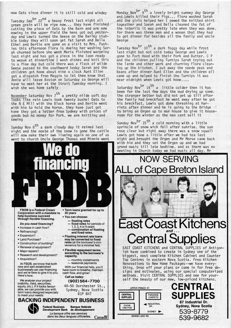 mow Oats since dinner it is still cold and windey Tuesday Sep'' 22"' a heavy frost last night all green grain will be ripe now... they have finished cutting the piece of Oats by the Barn and are now mowing in the upper field the hens got out yester? day and Lewis turned the Geese on the Barley stub? ble today they will soon get fat Sarah and Bella Ethel and Bertie are gone on a visit to Mrs. Push- ies this afternoon Flora is doeing her washing Sar? ah churned before she went Maria finished warpeing last night and has got a piece in the loom ready to weave at dinnertime I wash dishes and knit this is a fine day but cold there was a flock of wilde Geese passed to the southward today Sarah and the children got home about nine o clock Aunt Ellen got a dispatch from Maggie to let them know that Annie will leave Boston on Saturday so George will have to meet her at the Strait Tuesday morning. I wish she was home safely November Saturday Nov 7 a pretty milde soft day looks like rain Lewis took twenty bushel Oats to the N E Mill with the Black horse and Bertie went with him to hold the horse, they have just got home they got a letter from Sydney with prices of goods but no money for Pork, we are knitting and sewing Sunday Nov 8 a dark cloudy day it rained last night and the moste of the snow is gone the cattle will now make their own liveing again no one of us went to church Uncle George Thomas and Minnie went Vltedo financing FBDBIs a Federal Crown Corporation with a mandate to help business succeed through flexible financing. Do you need financing? • Increase in cash flow? • Refinancing? • Expansion? • Land Purchase? • Construction of building? • Renewal of equipment? • l'ajor repairs? • Research and development? • Acquisition? At FBDB, we know that both new and wjell established businesses can use financing and we're here to give it to you. Here's how. We analyse your project (viability, risks, securities, equity, etc.). If it looks favour? able, we can provide you with term loans designed especially to meet your needs: • Term loans granted for up to 20 years • You can choose: • floating rates • fixed rates for periods of 1,2,3,4 or 5 years • combination of floating and fixed rates. • Floating interest rate loans may be converted to fixed rates (at the borrower's con? venience for a minimal fee). • Flexible repayment terms according to the borrower's capacity. • monthly installments • seasonal payments With our financial help, you'll have room to breathe, maintain cash flow, and grow! Call us today: (902)564-7700 48-50 Dorchester St., Sydney, Nova Scotia BIP 6H7 BACKING INDEPENDENT BUSINESS Federal Business Banque federale Development Bank de developpement La banque offre ses services dans les deux langues officielles. Canada Monday Nov 9 a lovely bright sunney day George and Lewis killed their Pigs... Flora washed Sarah and the girls helped her I sewed the knitted shirt togeather and Sarah and Bella cleaned the fat of the interils it was pretty late when they was done, for there was three men and a woman that they had to get dinner fiDr besides all the family and uncle George Tuesday Nov '10 a dark foggy day while frost last night but not cold today George and Lewis gone to Port Hood with their Pork and Butter. C P and the children pulling Turnips Sarah trying out the larde and other work and churning Flora clean? ing up the kitchen. I put away the seede peas and Beans after dinner Aunt Ellen and the children all came up and helped to finish the Turnips it was near midnight when Lewis got home Saturday Nov '14 a little colder then it has been for the last few days the mud drying up some, the stranger better but did not get up till after the family had breckfast he went away after he got his breckfast. Lewis got done thrashing at Har? riets after dinner and he is going to the Bridge ' to bring an Orgen up to ?ur house to give it house- room for the winter as the man cant sell it Sunday Nov 15 a cold morning with a little sprincle of snow wich fell after sunrise, the sun rose clear but right away there was a snow squall Lewis got home a little after we had tea last night and brought the Orgen and Mr Morse came back with him and they set the Orgen up and we had grand music till late bedtime, and as there was no meeting in Church today we had music all day. Mr NOW SERVING ALL of Gape Breton Island East Coast Kitchens and... Central Supplies EAST COAST KITCHENS and CENTRAL SUPPLIES of Antigon? ish have combined to create in Sydney one of the biggest, most complete Kitchen Cabinet and Counter Top Centres in eastern Nova Scotia. From Kitchen Renovations to New Home Packages--we have every? thing. Drop off your plans or come in for free de? signs and estimates, using our special computerized methods. Visit CENTRAL SUPPLIES and see for your? self the beauty of our new, low-priced kitchens. CENTRAL SUPPLIES 87 Industrial Dr. Sydney, Nova Scotia 539-8779 539-9682 UPPER PRINCE ST. GRAND LAKE RD.