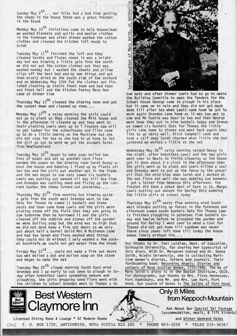 Sunday May 9 ... our folks had a bad time getting the sheep in the house there was a great freshet in the Brook Monday May 10 Christiana came to help housedean we washed Blankets and quilts and woolen clothes in the forenoon and after dinner washed the cotton clothes and cleaned the kitchen loft ready to scrub Tuesday May 11 finished the loft and they cleaned Sarahs and Floras rooms it was a bright day but was blowing a little gale from the north we did not put the cotton clothes out that was washed monday but I washed the sheets and pillow slips off the best bed and my own things and got them nicely dried on the south side of the orchard and on Wednesday May 12th Put the clothes out fin? ished cleaning up stairs front room and bed room and front Hall and the Kitchen Pantry Mary Ann came at dinner time Thursday May 13 cleaned the dineing room and got the carpet down and cleaned my room Monday May 17 a rainy morning the girls could not go to plant so they cleaned the Milk house and in the afternoon it cleared up and they went to their planting Lewis went up to T Erasers saw mill to get lumber for the schoolhouse and Ellen came up to do a little sewing on the Machiene but she did not stop for tea as she had to go home to let the girl go out to work we got the account Sales from Newfoundland Tuesday May 18 began to make soap boiled two Pots of boans and set up another Lech Flora mended the paper on the'dineing room Sarah Busey a- bout the house and Bakeing I fixed up my Plants af? ter tea and the girls put another mat in the frame and the men began to sow oats sowed six bushels Lewis was putting out manure all day till tea time and Grandpa was cutting seed and fixing up the cur? rant bushes the sheep turned out yesterday Thursday May 20 fine morning but blowing quite a gale from the south west Grandpa went to sow Oats for Thomas he sowed 11 bushels and three pecks and then came home Lewis and the girls were picking stone off the field that they are going to sow tomorrow then he harrowed it and the girls cleared off the rubbish and stones off the garden we were boiling soap but the wind was so high that we did not dare keep a fire out doors so we only got about half a barrel boild Mrs N McKinnon came and had tea Sarah and Flora washed what things they could not do without I only washed a few pock? et kerchiefs we could not get water from the brook Friday May 21' ... could not make a fire out doors too wet boiled a pot and boiled soap on the stove and began to make the mat Tuesday May 25 cloudy morning South East wind Grandpa and I up early to cut seed to plough in to? day after breckfast Lewis spredding manure and ploughing, the girls dropping seed Flora went with the children to school Grandpa went to Thomas s to w&mi.; sow oats and after dinner Lewis had to go to meete the Building Commitie to open the Tenders for the School house George came to plough in his place but it came on to rain and they did not get much done till after tea when Lewis came home he got to work again Grandpa came home as it was too wet to sow and Mr Pushie was hear to tea and then George went home they put in nine bushels today and Grand? pa sowed six bushels Oats for Thomas the little girls came home to dinner and went back again they like to go yerry well. Alick Campbell came and took a calf away Sarah churned what little she had gathered we worked a little at the mat Wednesday May 26 rainy morning rained heavy in the night, after breckfast Lewis and the two girls went over to Neals to finish cleaning up the house got it done about 3 o clock in the afternoon then the girls went up to plant and Lewis killed a veal and Grandpa went to put up the fence by the gravel pit that.the wind blew down Sarah and I worked at the mat Flora not well she was makeing sun bonnets I got a letter from Rebecca this afternoon, the freshet did them a great deal of harm in St. Marys Lewis putting out manure for Barley this evening the little girls at school today Thursday May 27 verry fine morning wind South west Grandpa putting up fences in the forenoon and afternoon sowed seven bushels Oats for Thomas Lew? is finished ploughing in potatoes five bushels to? day and twelve before he ploughed the garden and ground for Barley I went over to mend a Coat for Thomas did not get home till sundown was never there since James left home till today the house seems lonely without him • ... Our thanks to Dr. Toni Laidlaw, Dept. of Education, Dalhousie University, for sharing her typescript of this diary. With Dr. Margaret Conrad and Dr. Donna Smith, Acadia University, she is collecting Mari? time women's diaries, letters and journals. Their forthcoming book: Recording Angels: Diaries and Letters of Nova Scotian Women, 1770-1940. The ms of Mary Smith's diary is in the Beaton Institute, UCCB. For photographs, our thanks to Mrs. Flora Hennessey, Port Hawksbury, and Mr. and Mrs. Lee Hart, Port Hood. Our source of dates is The Smiths of Port Hood. Best Western Claymore Inn Licensed Dining Room & Lounge * 52 Modern Rooms (54) P.O. BOX 1720, ANTIGONISH, NOVA SCOTIA B2G 2M5 Only 8 Miles from Keppoch Mountain Ask About Our Special Ski Package (accommodation, meals, & lift tickets) and Winter Weekend Rates PHONE 863-1050 * TELEX 019-36567