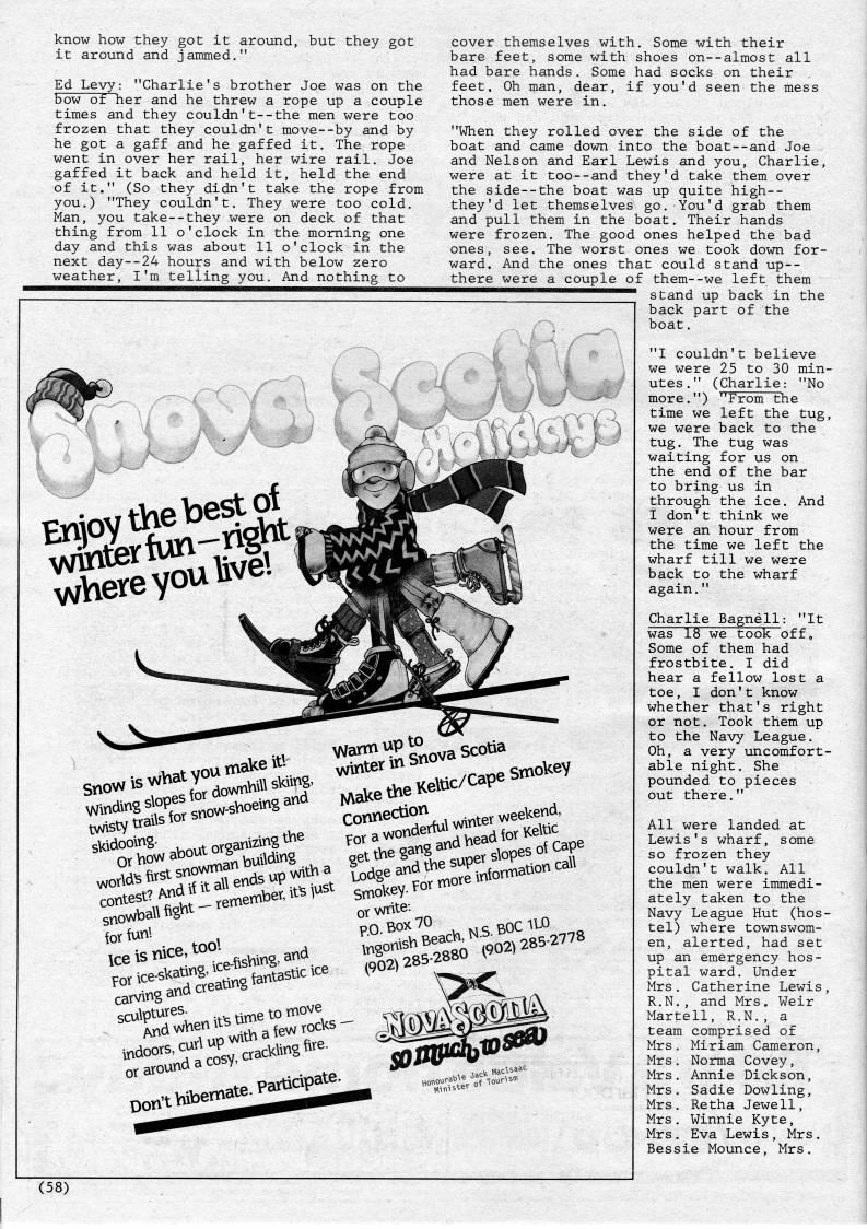 know how they got it around, but they got it around and jammed." Ed Levy: "Charlie's brother Joe was on the bow of her and he threw a rope up a couple times and they couldn't--the men were too frozen that they couldn't move--by and by he got a gaff and he gaffed it. The rope went in over her rail, her wire rail. Joe gaffed it back and held it, held the end of it." (So they didn't take the rope from you.) "They couldn't. They were too cold. Man, you take--they were on deck of that thing from 11 o'clock in the morning one day and this was about 11 o'clock in the next day--24 hours and with below zero weather, I'm telling you. And nothing to sUidooing. organizing the orViov'?a1oo'' i,buiid'S for iurt , carving aw ""ffv.enit.t'e??rn?-,s • ,oundacoV cover themselves with. Some with their bare feet, some with shoes on--almost all had bare hands. Some had socks on their feet. Oh man, dear, if you'd seen the mess those men were in. "When they rolled over the side of the boat and came down into the boat--and Joe and Nelson and Earl Lewis and you, Charlie, were at it too--and they'd take them over the side--the boat was up quite high-- they'd let themselves go. You'd grab them and pull them in the boat. Their hands were frozen. The good ones helped the bad ones, see. The worst ones we took down for? ward. And the ones that could stand up-- there were a couple of them--we left them '*''''''''''**''"'' • ' stand up back in the back part of the boat. "I couldn't believe we were 25 to 30 min? utes." (Charlie: "No more.") "From the time we left the tug, we were back to the tug. The tug was waiting for us on the end of the bar to bring us in through the ice. And I don't think we were an hour from the time we left the wharf till we were back to the wharf again." Charlie Bagnell: "It was 18 we took off?? Some of them had frostbite. I did hear a fellow lost a toe, I don't know whether that's right or not. Took them up to the Navy League. Oh, a very uncomfort? able night. She pounded to pieces out there." All were landed at Lewis's wharf, some so frozen they couldn't walk. All the men were immedi? ately taken to the Navy League Hut (hos? tel) where townswom- en, alerted, had set up an emergency hos? pital ward. Under Mrs. Catherine Lewis, R.N., and Mrs. Weir Martell, R.N., a team comprised of Mrs. Miriam Cameron, Mrs. Norma Covey, Mrs. Annie Dickson, Mrs. Sadie Dowling, Mrs. Retha Jewell, Mrs. Winnie Kyte, Mrs. Eva Lewis, Mrs. Bessie Mounce, Mrs. Myiarm up t? scotia pterin sno okeV KvaketheKetoc/Cape connection v'/eekend, or Amte-. PO. BOX 70 goC 'L0 ''- ??"??-Ster of '0''''" (58)
