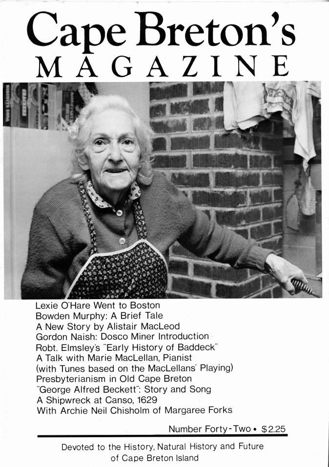 • Lexie O'Hare Went to Boston • Bowden Murphy: A Brief Tale • A New Story by Alistair MacLeod • Gordon Nash: DOSCO Miner Introduction • Robt. Elmsley's "Early History of Baddeck" • A Talk with Marie MacLellan, Pianist • Presbyterianism in Old Cape Breton • "George Alfred Beckett": Story & Song • A Shipwreck at Canso, 1629 • With Archie Neil Chisholm or Margaree Forks