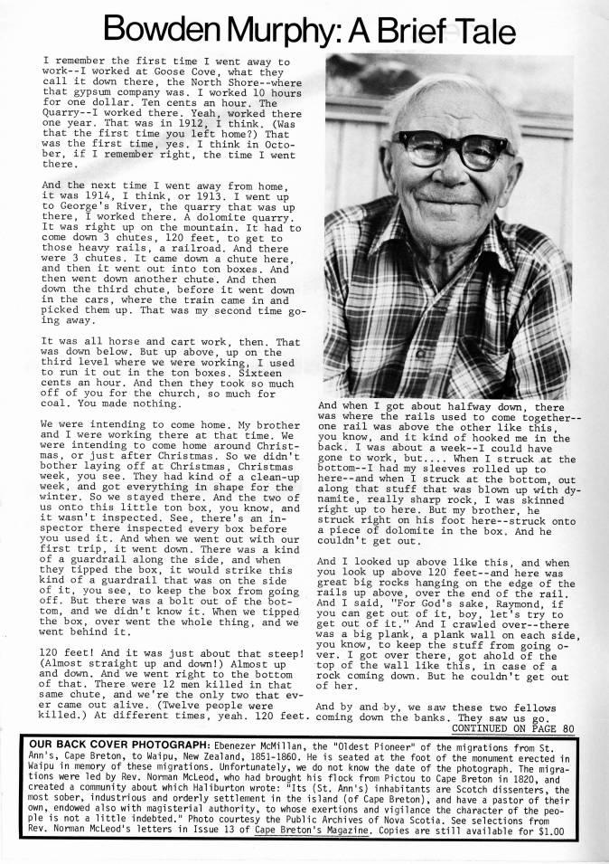 Published by Ronald Caplan on 1986/6/1 (718 reads)Bowden Murphy: A Brief Tale I remember the first time I went away to work--I worked at Goose Cove, what they call it down there, the North Shore--where that gypsum company was. I worked 10 hours for one dollar. Ten cents an hour. The Quarry--! worked there. Yeah, worked there one year • That was in 1912, I think. (Was that the first time you left home?) That was the first time, yes. I think in Octo? ber, if I remember right, the time I went there. And the next time I went away from home, it was 1914, I think, or 1913. I went up to George's River, the quarry that was up there, I worked there. A dolomite quarry. It was right up on the mountain. It had to come down 3 chutes, 120 feet, to get to those heavy rails, a railroad. And there were 3 chutes. It came down a chute here, and then it went out into ton boxes. And then went down another chute. And then down the third chute, before it went down in the cars, where the train came in and picked them up. That was my second time go? ing away. It was all horse and cart work, then. That was down below. But up above, up on the third level where we were working, I used to run it out in the ton boxes. Sixteen cents an hour. And then they took so much off of you for the church, so much for coal. You made nothing. We were intending to come home. My brother and I were working there at that time. We were intending to come home around Christ? mas, or just after Christmas. So we didn't bother laying off at Christmas, Christmas week, you see. They had kind of a clean-up week, and got everything in shape for the winter. So we stayed there. And the two of us onto this little ton box, you know, and it wasn't inspected. See, there's an in? spector there inspected every box before you used it. And when we went out with our first trip, it went down. There was a kind of a guardrail along the side, and when they tipped the box, it would strike this kind of a guardrail that was on the side of it, you see, to keep the box from going off. But there was a bolt out of the bot? tom, and we didn't know it. When we tipped the box, over went the whole thing, and we went behind it. 120 feet! And it was just about that steep! (Almost straight up and down!) Almost up and down. And we went right to the bottom of that. There were 12 men killed in that same chute, and we're the only two that ev? er came out alive. (Twelve people were killed.) At different times, yeah. 120 feet, ni'ta|P' And when I got about halfway down, there was where the rails used to come together-- one rail was above the other like this, you know, and it kind of hooked me in the back. I was about a week--I could have gone to work, but.... When I struck at the bottom--! had my sleeves rolled up to here--and when I struck at the bottom, out along that stuff that was blown up with dy? namite, really sharp rock, I was skinned right up to here. But my brother, he struck right on his foot here--struck onto a piece of dolomite in the box. And he couldn't get out. And I looked up above like this, and when you look up above 120 feet--and here was great big rocks hanging on the edge of the rails up above, over the end of the rail. And I said, "For God's sake, Raymond, if you can get out of it, boy, let's try to get out of it." And I crawled over--there was a big plank, a plank wall on each side, you know, to keep the stuff from going o- ver. I got over there, got ahold of the top of the wall like this, in case of a rock coming down. But he couldn't get out of her. And by and by, we saw these two fellows coming down the banks. They saw us go. CONTINUED ON PAGE 80 OUR BACK COVER PHOTOGRAPH: Ebenezer McMillan, the "Oldest Pioneer" of Ann's, Cape Breton, to Waipu, New Zealand, 1851-1860. He is seated at the foot Waipu in memory of these migrations. Unfortunately, we do not know the date of tions were led by Rev. Norman McLeod, who had brought his flock from Pictou to created a community about which Haliburton wrote: "Its (St. Ann's) inhabitants most sober, industrious and orderly settlement in the island (of Cape Breton), own, endowed also with magisterial authority, to whose exertions and vigilance pie is not a little indebted." Photo courtesy the Public Archives of Nova Scoti Rev. Norman McLeod's letters in Issue 13 of Cape Breton's Magazine. Copies are the migrations from St. of the monument erected in the photograph. The migra- Cape Breton in 1820, and are Scotch dissenters, the and have a pastor of their the character of the peo- a. See selections from still available for $1.00
