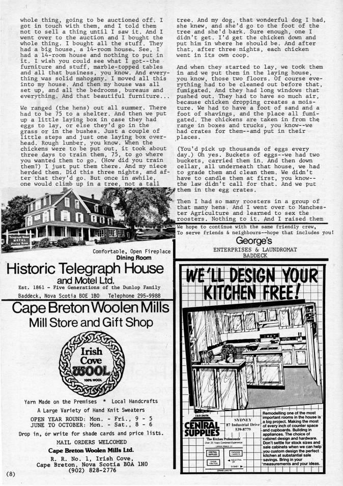 Published by Ronald Caplan on 1986/6/1 (325 reads)whole thing, going to be auctioned off. I got in touch with them, and I told them not to sell a thing until I saw it. And I went over to the auction and I bought the whole thing. I bought all the stuff. They had a big house, a 14-room house.. See, I had a 14-room house and nothing to put in it. I wish you could see what I got--the • furniture and stuff, marble-topped tables and all that business, you know. And every? thing was solid mahogany. I moved all this into my house. And then my house was all set up, and all the bedrooms, bureaus and everything. And that beautiful furniture... We ranged (the hens) out all summer. There had to be 75 to a shelter. And then we put up a little laying box in case they had eggs to lay, or else they'd go in the grass or in the bushes. Just a couple of little steps and just one laying box over? head. Rough lumber, you know. When the chickens were to be put out, it took about three days to train them, 75, to go where you wanted them to go. (How did you train them?) I just put them there. And my niece herded them. Did this three nights, and af? ter that they'd go. But once in awhile, one would climb up in a tree, not a tall Comfortable, Open Fireplace Dining Room Historic Telegraph House and Motel Ltd. Est. 1861 - Five Generations of the Dunlop Family Baddeck, Nova Scotia BOE IBQ Telephone 295-9988 Cape Breton Woolen Mills Mill Store and Gift Shop (8) Yarn Made on the Premises * Local Handcrafts A Large Variety of Hand Knit Sweaters OPEN YEAR ROUND: Men. - Fri., 9-5 JUNE TO OCTOBER: Mon. - Sat., 8 - 6 Drop in, or write for shade cards and price lists. MAIL ORDERS WELCOMED Cape Breton Woden Mills Ltd. R. R. No. 1, Irish Cove, Cape Breton, Nova Scotia BOA IHO (902) 828-2776 tree. And my dog, that wonderful dog I had, she knew, and she'd go to the foot of the tree and she'd bark. Sure enough, one I didn't get, I'd get the chicken down and put him in where he should be. And after that, after three nights, each chicken went in its own coop. And when they started to lay, we took them in and we put them in the laying house, you know, those two floors. Of course eve? rything had to be cleaned out before that, fumigated. And they had long windows that pushed out. They had to have so much air, because chicken dropping creates a mois? ture. We had to have a foot of sand and a foot of shavings, and the place all fumi? gated. The chickens are taken in from the range in boxes and trucks, you know--we had crates for them--and put in their places. (You'd pick up thousands of eggs every day.) Oh yes. Buckets of eggs--we had two buckets, carried them in. And then down cellar, all underneath that house, we had to grade them and clean them. We didn't have to candle them at first, you know-- the law didn't call for that. And we put them in the egg crates. Then I had so many roosters in a group of that many hens. And I went over to Manches? ter Agriculture and learned to sex the roosters. Nothing to it. And I raised them We hope to continue with the same friendly crew. To serve friends & neighbours • hope that includes you! George's ENTERPRISES & LAUNDROMAT BADDECK inffiMpKieMm riiraii-riiiHi'j'i*'! 'TzmSS''Sfcil m SYDNKY 87 Industrial Drive 539-8779 The Kitchen Proiesionals' ~ Over 35 Years Comtxned Expenence UPPER PRINCE ST ~ GRAND LAKE RD 4- Remodelling one of the most important rooms in the house is a big project. Making the most of every inch of counter space and cupt>oards. Building in appliances. The choice of cabinet design and hardware. Don't settle for stock sizes and sale cabinets when we can help you custom design the perfect . kitchen at substantial sale savings. Bring in your 'measurements and your ideas.