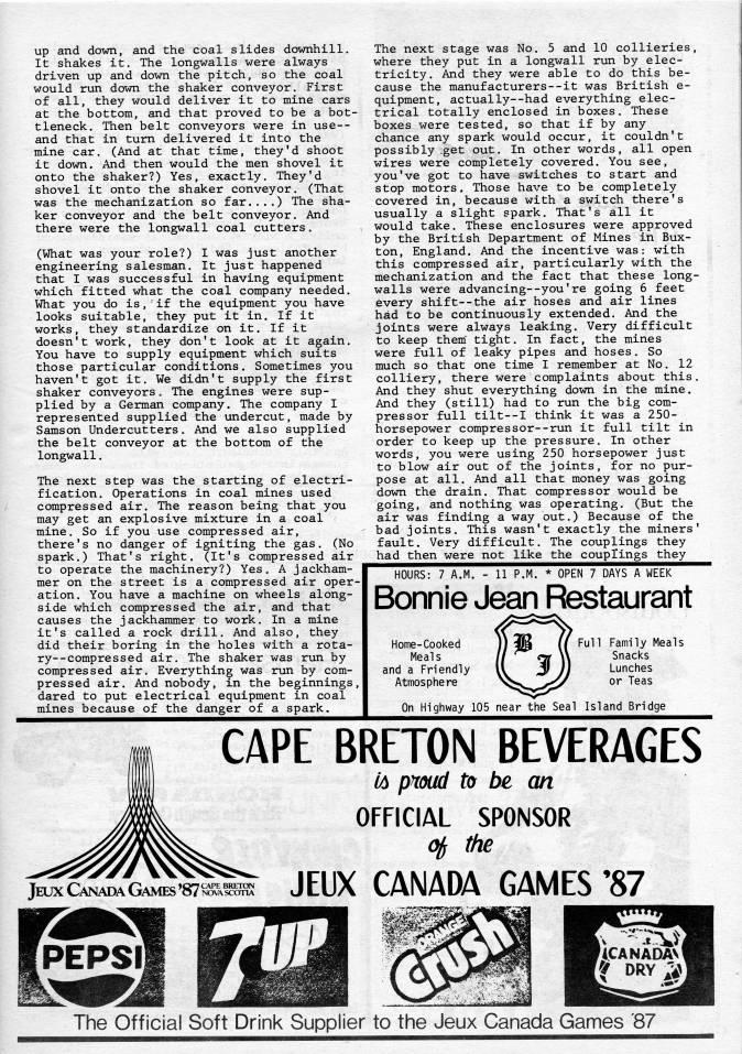 Published by Ronald Caplan on 1986/6/1 (308 reads)up and down, and the coal slides downhill. It shakes it. The longwalls were always driven up and down the pitch, so the coal would run down the shaker conveyor. First of all, they would deliver it to mine cars at the bottom, and that proved to be a bot? tleneck. Then belt conveyors were in use-- and that in turn delivered it into the mine car. (And at that time, they'd shoot it down. And then would the men shovel it onto the shaker?) Yes, exactly. They'd shovel it onto the shaker conveyor. (That was the mechanization so far....) The sha? ker conveyor and the belt conveyor. And there were the longwall coal cutters. (What was your role?) I was just another engineering salesman. It just happened that I was successful in having equipment which fitted what the coal company needed. What you do is, if the equipment you have looks suitable, they put it in. If it works, they standardize on it. If it doesn't work, they don't look at it again. You have to supply equipment which suits those particular conditions. Sometimes you haven't got it. We didn't supply the first shaker conveyors. The engines were sup? plied by a German company. The company I represented supplied the undercut, made by Samson Undercutters. And we also supplied the belt conveyor at the bottom of the longwall. The next step was the starting of electri? fication. Operations in coal mines used compressed air. The reason being that you may get an explosive mixture in a coal mine. So if you use compressed air, there's no danger of igniting the gas. (No spark.) That's right. (It's compressed air to operate the machinery?) Yeso A jackham- mer on the street is a compressed air oper? ation. You have a machine on wheels along? side which compressed the air, and that causes the jackhammer to work. In a mine it's called a rock drill. And also, they did their boring in the holes with a rota? ry- -compressed air. The shaker was run by compressed air. Everything was run by com? pressed air. And nobody, in the beginnings, dared to put electrical equipment in coal mines because of the danger of a spark. The next stage was No. 5 and 10 collieries, where they put in a longwall run by elec? tricity. And they were able to do this be? cause the manufacturers--it was British e- quipment, actually--had everything elec? trical totally enclosed in boxes. These boxes were tested, so that if by any chance any spark would occur, it couldn't possibly .get out. In other words, all open wires were completely covered. You see, you've got to have switches to start and stop motors. Those have to be completely covered in, because with a switch there's usually a slight spark. That's all it would take. These enclosures were approved by the British Department of Mines in Bux? ton, England. And the incentive was: with this compressed air, particularly with the mechanization and the fact that these long- walls were advancing--you're going 6 feet every shift--the air hoses and air lines had to be continuously extended. And the joints were always leaking. Very difficult to keep them" tight. In fact, the mines were full of leaky pipes and hoses. So much so that one time I remember at No. 12 colliery, there were complaints about this. And they shut everything down in the mine. And they (still) had to run the big com? pressor full tilt--I think it was a 250- horsepower compressor--run it full tilt in order to keep up the pressure. In other words, you were using 250 horsepower just to blow air out of the joints, for no pur? pose at all. And all that money was going down the drain. That compressor would be going, and nothing was operating. (But the air was finding a way out.) Because of the bad joints. This wasn't exactly the miners' fault. Very difficult. The couplings they had then were not like the couplings they HOURS: 7 A.M. - 11 P.M. * OPEN 7 DAYS A WEEK Bonnie Jean Restaurant Home-Cooked Meals and a Friendly Atmosphere Full Family Meals Snacks Lunches or Teas On Highway 105 near the Seal Island Bridge [eux Canada Games'87''"'' CAPE BRETON BEVERAGES b p'oud to be an OFFICIAL SPONSOR (' the JEUX CANADA GAMES '87 NOV[ SCOTIA PEPSI ??'T-'T''yj?*'-- The Official Soft Drink Supplier to the Jeux Canada Games '87