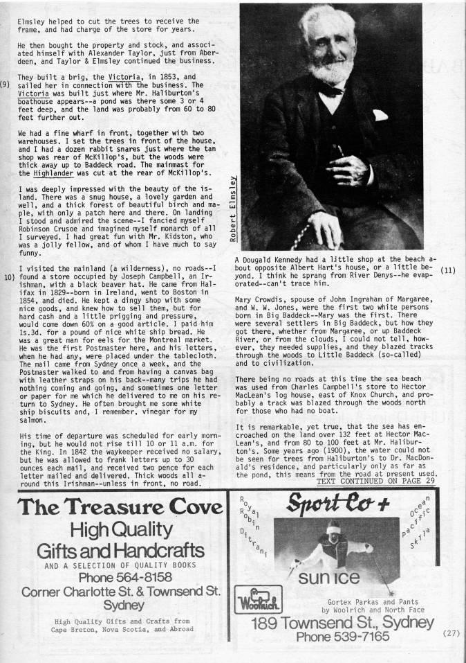 Elmsley helped to cut the trees to receive the frame, and had charge of the store for years. He then bought the property and stock, and associ? ated himself with Alexander Taylor, just from Aber? deen, and Taylor & Elmsley continued the business. They built a brig, the Victoria, in 1853, and [9) sailed her in connection with the business. The Victoria was built just where Mr. Haliburton's boathouse appears--a pond was there some 3 or 4 feet deep, and the land was probably from 60 to 80 feet further out. We had a fine wharf in front, together with two warehouses. I set the trees in front of the house, and I had a dozen rabbit snares just where the tan shop was rear of McKillop's, but the woods were thick away up to Baddeck road. The mainmast for the Highlander was cut at the rear of McKillop's. I was deeply impressed with the beauty of the is? land. There was a snug house, a lovely garden and well, and a thick forest of beautiful birch and ma? ple, with only a patch here and there. On landing I stood and admired the scene--I fancied myself Robinson Crusoe and imagined myself monarch of all I surveyed. I had great fun with Mr. Kidston, who was a jolly fellow, and of whom I have much to say funny. I visited the mainland (a wilderness), no roads--I 10) found a store occupied by Joseph Campbell, an Ir? ishman, with a black beaver hat. He came from Hal? ifax in 1829--born in Ireland, went to Boston in 1854, and died. He kept a dingy shop with some nice goods, and knew how to sell them, but for hard cash and a little prigging and pressure, would come down 60% on a good article. I paid him Is.3d. for a pound of nice white ship bread. He was a great man for eels for the Montreal market. He was the first Postmaster here, and his letters, when he had any, were placed under the tablecloth. The mail came from Sydney once a week, and the Postmaster walked to and from having a canvas bag with leather straps on his back--many trips he had nothing coming and going, and sometimes one letter or paper for me which he delivered to me on his re? turn to Sydney. He often brought me some white ship biscuits and, I remember, vinegar for my salmon. His time of departure was scheduled for early morn? ing, but he would not rise till 10 or 11 a.m. for the King. In 1842 the waykeeper received no salary, but he was allowed to frank letters up to 30 ounces each mail, and received two pence for each letter mailed and delivered. Thick woods all a- round this Irishman • unless in front, no road. A Dougald Kennedy had a Little shop at the beach a- bout opposite Albert Hart's house, or a little be? yond. I think he sprang from River Denys--he evap- orated--can't trace him. Mary Crowdis, spouse of John Ingraham of Margaree, and W. W. Jones, were the first two white persons born in Big Baddeck--Mary was the first. There were several settlers in Big Baddeck, but how they got there, whether from Margaree, or up Baddeck River, or from the clouds, I could not tell, how? ever, they needed supplies, and they blazed tracks through the woods to Little Baddeck (so-called) and to civilization. There being no roads at this time the sea beach was used from Charles Campbell's store to Hector MacLean's log house, east of Knox Church, and pro? bably a track was blazed through the woods north for those who had no boat. It is remarkable, yet true, that the sea has en? croached on the land over 132 feet at Hector Mac- Lean's, and from 80 to 100 feet at Mr. Halibur? ton's. Some years ago (1900), the water could not be seen for trees from Haliburton's to Dr. MacDon- ald's residence, and particularly only as far as the pond, this means from the road at present used. TEXT CONTINUED ON PAGE 29 (11) The Treasure Cove High Quality Gifts and Hardcrafts AND A SELECTION OF QUALITY BOOKS Phone 564-8158 Corner Charlotte St. & Townsend St. Sydney High Quality Gifts and Crafts from Cape Breton, Nova Scotia, and Abroad $jtctttc-+ Gortex Parkas and Pants by Woolrich and North Face 189 Townsend St., Sydney Phone 539-7165 (2'>