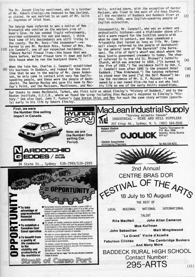 Published by Ronald Caplan on 1986/6/1 (800 reads)(6) The Dr. Joseph Elmsley mentioned, who is a brother of Mr. Robert Elmsley • he removed to New Zealand, as stated. He was married to an aunt of Mr. Colin J. Ingraham of Inlet Road. The George Hume referred to was a native of New Brunswick who settled on the western side of Hume's Cove. He too vended liquid refreshments, provided sustenance for man and beast. I think that some of his descendants are still living in the county. The Mr. Ross • "the shoemaker"--re- ferred to was Mr. Murdock Ross, father of Mrs. Bes? sie Campbell, one of our respected residents. ("Where Muriel Pinaud lives • the house that was there before. Walter Pinaud tore it down and built this house when he ran the boatyard there.") When the late Hon. Charles J. Campbell established his business in Baddeck, and indeed for the short time that he was in the employ of Mr. James Ander? son, he only came in contact with very few Gaelic- speaking people, and these were the people of Wash? abuckt. The George MacKay who gave his name to Mac? Kay's Point, and the MacLeans, MacKinnons, and Mac? Neils, settled there. With the exception of Hector MacLean, who lived to the east of old Knox Church, all the residents of Baddeck and Baddeck River at that time, 1840, were English-speaking people of English extraction. Consequently, Mr. Campbell, who was an ardent and enthusiastic Scotsman • and a Highlander above all- held a warm regard for the Scottish people with whom he came in contact, and thus commenced a friendship that lasted as long as life. Mr. Camp? bell always referred to the people of Washabuckt by the general term of "Na Barraich" (the Barra- men). The site of Hart's wharf was about where the Nova Scotia government creamery is today. The chap? el referred to is the old St. Michael's Catholic Church, which was erected in 1858. ("It burned in the fire of 1926.") The residence built by Hon. C. J. Campbell soon after 1840 is the present Hotel Baddeck. ("Now Alderwood.") The tanshop referred to stood near the pond ("at the Bell Museum") be? low the residence of Mr. D. P. McLeod--it was owned by a man named Rice--he had a son who lost his life on one of the early Arctic expeditions. (2) (4) (18) (9) Our thanks to James MacDonald, Tarbot, who first told us about Elmsley's "History of Baddeck," and to the Beaton Institute, U.C.C.B., where we found the scrap including Alex MacLean's response to Elmsley's "His? tory." See also Capt. John P. Parker's Cape Breton Ships and Men for much the same story written (possibr ly) early in his life by Robert Elmsley. HYunoni First, we were the Number One selling Import in Canada. Now, we are the Number One selling Car. Period. ['EODES / SS' 34 State St., Sydney 539-7999/539-2999 MacLean Industrial SupDly ''1 "Serving Atlantic Canada" T|.|{ INDUSTRIAL - MINE AND MILL SUPPLIES "** 207 Kings Rd., Sydney, N. S. (902) 564-5540 Robert Ojoiick MRAIC/MCIP OJOUCK Ojoiick Associates * Architects/Planners Twenty Townsend St PC Box 1058 Sydney, Nova Scotia B1P 6J7 Tel 902 539 8075 I "To take I advantage of (unprecedented financial assistance . • To establish a Canadian East ' Coast operation '' To benefit from a quality of I life conducive to the I stability and i productivity of ' the workforce ?? Remarkable financial assistance includes a grant of 30% of building and equipment costs plus a grant of up to 30% on the balance of approved capital costs plus a tax credit of 60% on capital costs to companies locating in the Cape Breton tax zone. • The Strait of Canso Port provides a strategic market location on a deep, ice-free harbour, with existing industrial parks and support services. A Our people are reliable, productive workers with a sense of pride in the quality of their work and the personal fulfilment of participation in the many activities of small communities. On-the-job training programs assist in adapting workers to the skills of a particular industry or business. We offer an unique opportunity - grants, other financial incentives, a favourable tax status, industrial infrastructure, a prime location and the active support of municipal, provin? cial and federal governments. For details, contact the Executive Director, Strait of Canso Industrial Development Authority, Box 610, Port Hawkesbury, Nova Scotia, Canada, BOE 2V0. 902-625-1631 Telex: 019 37532 It has been said that our region "has the most attractive investment climate in Canada." Mm& ??G (''m:&) lKofS 2nd Annual CENTRE BRAS DOR ..W't OF THE' ' 18 July to 10 August 'i LOCAL THE BEST OF REGIONAL NATIONAL INTERNATIONAL TALENT Rita MacNeil John Allan Cameron Moe Koffman John Sebastian Matt Minglewood "La Grand " Visite d'Acadie Fabulous Cliches The Cambridge Buskers ...And Many More BADDECK RURAL HIGH SCHOOL Contact Number: 295-ARTS (31)