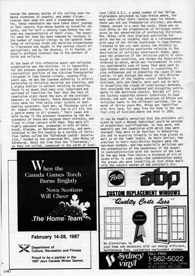 Published by Ronald Caplan on 1986/6/1 (279 reads)charge the onerous duties of his calling over im? mense stretches of country, and under circum? stances that made his work a tremendous burden. Yes, these remarkable men have taken their journey to that country from whose bourne no traveller re? turns, and for half a century Cape Breton has not seen any representative of their class. The espec? ial need for them has been removed by increase in the number of regular clergy; by the general know? ledge of religious truth and doctrine disseminated in literature and taught in the various church or? ganizations; and by the absence, it is feared, of equally profound interest now in the matters of faith and religion. At the head of this effective moral and religious organization was the minister. It is impossible for the present generation to realize the exact ec? clesiastical position of the old-time Presbyterian clergyman in Cape Breton • ninety, seventy-five years ago. He was the supreme authority in affairs pertaining to Christian doctrine and practice, and a mighty arbiter in matters relating to morality. There is no doubt that many sins languished and perished of inanition for fear that the fact of commission might reach the ears of the minister. However, as individuals, these Ambassadors of the Cross were far from being cruel tyrants or domi? neering autocrats. Each was, as Thackeray said of Dr. Samuel Johnson, "a fierce foe to all sin, but a gentle enemy to all sinners." Their names are held to-day in the greatest reverence by the de? scendants of those who enjoyed their ministry, and lived in close contact with them. They were all highly educated men, graduates in Arts of Edin? burgh, Glasgow, or Aberdeen University, and were selected in the Old Country by a society of Chris? tian ladies called the "Edinburgh Ladies' Associa? tion," headed by the celebrated Mrs. John McKay of Edinburgh. About the time that the "Clearances," as they are called, commenced in the north of Scot- hen the Canada Games Torch Burns Brightly Nova Scotians Will Cheer :. • • ?: • . • . • • • . • • . • • ??. • . :'- . • ??;"* • :' • ??-. • • • • ; • • • . • • : • :;:>: • ?. JheHomeTe'rn February 14-28, 1987 Nova Scotia Department of Culture, Recreation and Fitness Proud to be a partner in ttie 1987 Jeux Canada Winter Games. (48) land (1810 A.D.), a great number of her fellow Highlanders emigrated to Cape Breton where, for many years after their landing upon its shores, there was not one Presbyterian minister, and where indeed, except in a yery few spots, there was no such thing as the dispensation of religious ordin? ances by any denomination of professing Christians. Mrs. McKay, with that Highland patriotism for which she was so notable, kept up a correspondence with many of her fellow countrymen in Cape Breton, listened to the cry sent across the Atlantic by some of the Christian patriarchs relative to the destitution of religious observances there, awak? ened the attention of the Christian public of Edin? burgh to the condition, and formed the Association referred to above, which was instrumental in rais? ing considerable sums of money that were sent to Cape Breton and expended there in supporting Di? vine ordinances and in promoting the cause of edu- 'cation. It was through the means of this Mission that several of the leading school teachers in Scotland, male and female, were sent out to help in dispelling the clouds of intellectual darkness that enveloped the scattered and struggling settle? ments in the destitute country. Besides all this, the Society supported several Catechists in Cape Breton, and sent out large donations of Bibles and religious books to the different parishes. For up? wards of thirty years Mrs. McKay was identified with this land, far away from her home in the cap? ital city of Scotland where she died in 1850. It can be readily perceived that the ministers sel? ected by such a devout individual would be persons of exceptional qualifications. So they were, and emphatic was the Commission with which they were charged 1 They were to be fearless in denouncing sin and in exposing iniquity in the high places as well as on the lower levels. On their arrival, how precious to their soul-thirsty hearers were the two-hour sermons, and how especially delicious was the presentation of the tenderness of the Gospel in contradistinction with the terrors of the Lawl On the way home from church • a distance of six or seven miles in some cases--the conversation among the groups who were travelling on foot often dealt with the subject matter of the minister's dis- CUSTOM BEPLACEMEMT WlilBOWS No alterations to your home are necessary with our energy efficient, maintenance free, customized replacement windows.