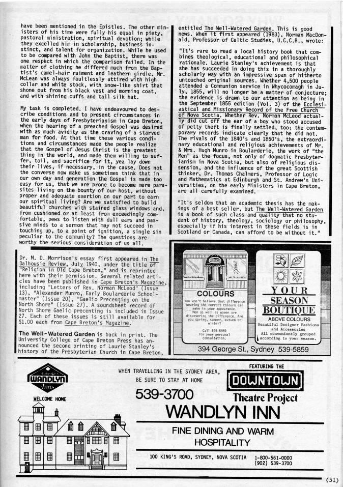 Published by Ronald Caplan on 1986/6/1 (187 reads)have been mentioned in the Epistles. The other min? isters of his time were fully his equal in piety, pastoral ministration, spiritual devotion; while they excelled him in scholarship, business in? stinct, and talent for organization. While he used to be compared with John the Baptist, there was one respect in which the comparison failed. In the matter of clothing he differed much from the Bap? tist's camel-hair raiment and leathern girdle. Mr. McLean was always faultlessly attired with high collar and white stock, with snow-like shirt that shone out from his black vest and morning coat, and with shining cuffs and tall silk hat. My task is completed. I have endeavoured to des? cribe conditions and to present circumstances in the early days of Presbyterianism in Cape Breton, when the hearing of a preached Gospel was desired with as much avidity as the craving of a starved man for foodo At that time these various condi? tions and circumstances made the people realize that the Gospel of Jesus Christ is the greatest thing in the world, and made them willing to suf? fer, toil, and sacrifice for it, yea lay down their lives, if necessary, in the cause. Does not the converse now make us sometimes think that in our own day and generation the Gospel is made too easy for us, that we are prone to become mere para? sites living on the bounty of our host, without proper and adequate exertion on our part to earn our spiritual living? Are we satisfied to build beautiful churches with stained glass windows and, from cushioned or at least from exceedingly com? fortable, pews to listen with dull ears and pas? sive minds to a sermon that may not succeed in touching up, to a point of ignition, a single sin peculiar to the community? The questions are worthy the serious consideration of us all. Dr. M. D. Morrison's essay first appeared in The Dalhousie Review, 3u'y' 1940, under the title of "Religion in Old Cape Breton," and is reprinted here with their permission. Several, related arti? cles have been published in Cape Breton's Magazine, including "Letters of Rev. Norman McLeod" (Issue 13), "Alexander Munro,. Early Boularderie School? master" {Issue 20), "Gaelic Precenting on the North Shore" (Issue 27). A soundsheet record of North Shore Gaelic precenting is included in Issue 27. Each of these issues is still available for $1.00 each from Cape Breton's Magazine. The Well-Watered Garden is back in print. The University College of Cape Breton Press has an? nounced the second printing of Laurie Stanley's history of the Presbyterian Church in Cape Breton, entitled The Well-Watered Garden. This is good news. When it first appeared (1983), Norman MacDon? ald, Professor of Celtic Studies, U.C.C.B., wrote: "It's rare to read a local history book that com? bines theological, educational and philosophical rationale. Laurie Stanley's achievement is that she has succeeded in doing this in a thoroughly scholarly way with an impressive span of hitherto untouched original sources. Whether 4,500 people attended a Communion service in Whycocomagh in Ju? ly, 1855, will no longer be a matter of conjecture; the evidence is drawn to our attention as being in the September 1855 edition (Vol. 3) of the Ecclesi? astical and Missionary Record of the Free Church of Nova Scotia. Whether Rev. Norman McLeod actual? ly did cut off the ear of a boy who stood accused of petty theft is finally settled, too; the contem? porary records indicate clearly that he did not. The rivals of the 1840's and 1850's, the extraordi? nary educational and religious achievements of Mr. & Mrs. Hugh Munro in Boularderie, the work of "the Men" as the focus, not only of dogmatic Presbyter? ianism in Nova Scotia, but also of religious dis? sension, and the influence of the great Scottish thinker. Dr. Thomas Chalmers, Professor of Logic and Mathematics at Edinburgh and St. Andrew's Uni? versities, on the early Ministers in Cape Breton, are all carefully examined. "It's seldom that an academic thesis has the mak? ings of a best seller, but The Well-Watered Garden is a book of such class and quality that no stu- dent of history, theology, sociology or philosophy, especially if his interest in these fields is in Scotland or Canada, can afford to be without it." You won't believe that difference wearing the correct colours can make in your appearance. Men as well as women are discovering the difference. Are you spring, summer, autumn or winter? Call 539-5859 for your personal consultation. SEASON -1 BOUTIQUE ABOVE COLOURS Beautiful Designer Fashions and Accessories All conveniently grouped 'according to your season. 394 George St., Sydney 539-5859 FEATURING THE WHEN TRAVELLING IN THE SYDNEY AREA, BE SURE TO STAY AT HOME DOUINTOUN 539-3700 Theatre Project WANDLYN INN FINE DINING AND WARM HOSPITALITY 100 KING'S ROAD, SYDNEY. NOVA SCOTIA 1-800-561-0000 (902) 539-3700 (51)