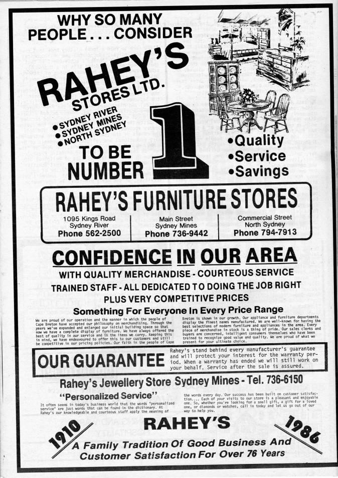 Published by Ronald Caplan on 1986/6/1 (433 reads)WHY SO MANY PEOPLE... CONSIDER w TO BE NUMBER Quality Service Savings RAHEY'S FURNITURE STORES 1095 Kings Road Sydney River Phone 562-2500 Main Street Sydney Mines Phone 736-9442 Commercial Street North Sydney Phone 794-7913 CONFIDENCE IN OUR AREA WITH QUALITY MERCHANDISE- COURTEOUS SERVICE TRAINED STAFF - ALL DEDICATED TO DOING THE JOB RIGHT PLUS VERY COMPETITIVE PRICES Something For Everyone In Every Price Range We are proud of our operation and the manner in which the people of Cape Breton have accepted our philosophy on merchandising. Through the years we've expanded and enlarged our initial building space so that now we have a complete display of furniture. We have always offered the best of quality in our service and in the items we carry. Keeping this in mind, we have endeavoured to offer this to our customers and still be competitive in our pricing policies. Our faith in the people of Cape Breton is shown in our growth. Our appliance and furniture departments display the finest names manufactured. We are well-known for having the best selections of modern furniture and appliances in the area. Every piece of merchandise in stock is a thing of pride. Our sales clerks and buyers are concerned, intelligent consumers themselves who have been trained to recognize good value and quality. We are proud of what we present for your ultimate choice. OUR GUARANTEE Rahey's stand behind every manufacturer's guarantee and win protect your interest for the warranty per? iod. When a warranty has ended we will still work on your behalf. Service after the sale is assured. Rahey's Jewellery Store Sydney Mines - Tel. 736-6150 "Personalized Service" It often seems in today's business world that the words "personalized service" are just words that can be found in the dictionary. At Rahey's our knowledgeable and courteous staff apply the meaning of the words every day. Our success has been built on customer satisfac? tion Each of your visits to our store is a pleasant and enjoyable one. So, whether you're looking for a small gift, a gift for a loved one, or diamonds or watches, call in today and let us go out of our way to help you. RAHEY'S A Family Tradition Of Good Business And Customer Satisfaction For Over 76 Years