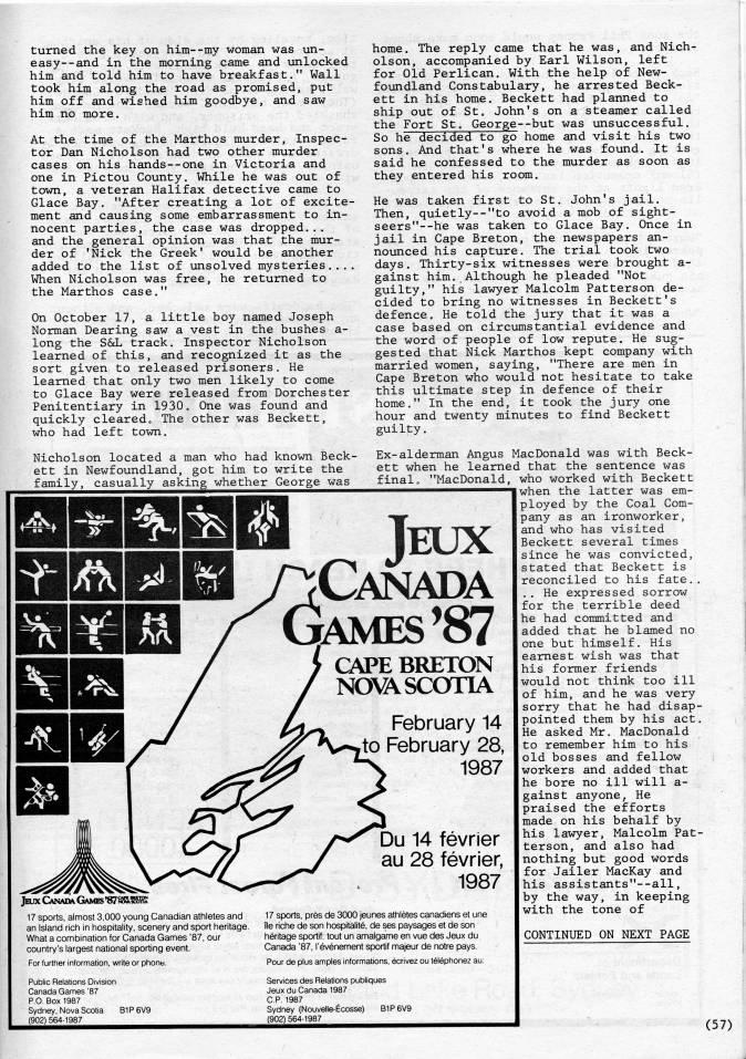 Published by Ronald Caplan on 1986/6/1 (286 reads)turned the key on him--my woman was un? easy--and in the morning came and unlocked him and told him to have breakfast." Wall took him along the road as promised, put him off and wished him goodbye, and saw him no more. At the time of the Marthos murder. Inspec? tor Dan Nicholson had two other murder cases on his hands--one in Victoria and one in Pictou County. While he was out of town, a veteran Halifax detective came to Glace Bay. "After creating a lot of excite? ment and causing some embarrassment to in? nocent parties, the case was dropped... and the general opinion was that the mur? der of 'Nick the Greek' would be another added to the list of unsolved mysteries.... When Nicholson was free, he returned to the Marthos case." On October 17, a little boy named Joseph Norman Dearing saw a vest in the bushes a- long the S&L; track. Inspector Nicholson learned of this, and recognized it as the sort given to released prisoners. He learned that only two men likely to come to Glace Bay were released from Dorchester Penitentiary in 1930. One was found and quickly cleared. The other was Beckett, who had left town. Nicholson located a man who had known Beck? ett in Newfoundland, got him to write the family, casually asking whether George was Jeux Canada GAMES*87'!@iR!;! 17 sports, almost 3,000 young Canadian athletes and an Island rich in hospitality, scenery and sport heritage. What a combination for Canada Gannes '87, our country's largest national sporting event. For further information, write or phone. Public Relations Division Canada Games '87 P.O. Box 1987 Sydney, Nova Scotia B1P6V9 (902)564-1987 home. The reply came that he was, and Nich? olson, accompanied by Earl Wilson, left for Old Perlican. With the help of New? foundland Constabulary, he arrested Beck? ett in his home. Beckett had planned to ship out of St, John's on a steamer called the Fort St, George--but was unsuccessful. So he decided to go home and visit his two sons. And that's where he was found. It is said he confessed to the murder as soon as they entered his room. He was taken first to St. John's jail. Then, quietly--"to avoid a mob of sight- seers"--he was taken to Glace Bay. Once in jail in Cape Breton, the newspapers an? nounced his capture. The trial took two days. Thirty-six witnesses were brought a- gainst him. Although he pleaded "Not guilty," his lawyer Malcolm Patterson de? cided to bring no witnesses in Beckett's defence. He told the jury that it was a case based on circumstantial evidence and the word of people of low repute. He sug? gested that Nick Marthos kept company with married women, saying, "There are men in Cape Breton who would not hesitate to take this ultimate step in defence of their home." In the end, it took the jury one hour and twenty minutes to find Beckett guilty. Ex-alderman Angus MacDonald was with Beck? ett when he learned that the sentence was final, "MacDonald, who worked with Beckett when the latter was em? ployed by the Coal Com- Jlpany as an ironworker, WIW T''J' I and who has visited J'IJ'L I Beckett several times • *''' I since he was convicted, ?? stated that Beckett is reconciled to his fate.. .. He expressed sorrow for the terrible deed he had committed and added that he blamed no one but himself. His earnest wish was that his former friends would not think too ill of him, and he was very sorry that he had disap? pointed them by his act. He asked Mr. MacDonald to remember him to his old bosses and fellow workers and added that he bore no ill will a- gainst anyone, He praised the efforts made on his behalf by his lawyer, Malcolm Pat? terson, and also had nothing but good words for Jailer MacKay and his assistants"--all, by the way, in keeping with the tone of EUX Canada Games'87 CAPE BRETON NON' SCOTIA February 14 February 28, 1987 Du 14 fevrier au 28 fevrier, 1987 17 sports, pres de 3000 jeunes athletes canadiens et une Tie riche de son hospitalite, de ses paysages et de son heritage sportif: tout un annalgame en vue des Jeux du Canada '87,1'evenennent sportif majeur de notre pays. Pour de plus amples informations, ecrivez ou telephonez au; Services des Relations publiques Jeux du Canada 1987 C.P. 1987 Sydney (Nouvelle-Ecosse) B1P6V9 (902) 564-1987 CONTINUED ON NEXT PAGE (57)