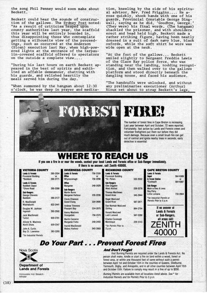 Published by Ronald Caplan on 1986/6/1 (280 reads)the song Phil Penney would soon make about Beckett. Beckett could hear the sounds of construc? tion of the gallows. The Sydney Post noted: "As a result of criticism heaped upon county authorities last year, the scaffold this ye,ar will be entirely boarded in, thus disappointing those who contemplate getting a silhouette view of the proceed? ings , such as occurred at the Anderson (Sloan) execution last May, when high-pow? ered lights at the entrance of the tarpau? lin-covered scaffold offered to spectators on the outside a complete view.... "During his last hours on earth Beckett ap? peared in the best of spirits and exhib? ited an affable demeanour, chatting with his guards, and relished heartily the meals served him during the day. "When summoned by the hangman about 12:30 o'clock, he was deep in prayer and medita- tion, kneeling by the side of his spiritu? al advisor. Rev, Fred Friggins.... He a- rose quickly, shook hands with one of his guards, Provincial Constable George Ding? wall, saying as he did, 'Goodbye, George.' (They were) his final words. (The hangman) shackled the prisoner, and with shoulders erect and head held high, Beckett made a rather striking figure, having been neatly dressed in a suit of dark navy blue, black oxfords, while the saft shirt he wore was wide open at the neck. "At the foot of the gallows... Beckett smiled slightly to Sergeant Freddie Lewis of the Glace Bay police force, who was standing near the landing, nodding recogni? tion, and then walked over to the gallows platform and stood directly beneath the dangling noose, and faced his audience. "The handcuffs were unlocked, and without any preliminaries executioner (Arthur) Rioux set about to strap Beckett's legs. FIlUi:! The number of forest fires in Cape Breton is increasing. Last year between April and October, 72 were reported. Fortunately, fast action by Lands and Forests crews and volunteer firefighters put them out before they did much damage. Because even a small brush fire can get out of control and ignite nearby trees in seconds, early detection is essential. WHERE TO REACH US If you see a fire in or near tlie woods, contact your local If there is no answer, VICTORIA COUNTY Lands & Forests Provincial Building *Baddecl< Lands & Forests Baddeck Depot *Shore Road Sub-Rangers George Cheverie Baddeck R. MacDonald Washabuckt Douglas W. Jackson Ingonish Jack MacDonald Tarbot Allister N. Maclnnis North Shore John A. Curtis Bay St. Lawrence *for Industrial Permits 295-2554 or 295-2771 295-2300 295-2177 622-2441 285-2502 929-2781 929-2347 383-2293 INVERNESS COUNTY Lands & Forests Office Whycocomagh Office Margaree Sub-Rangers Martin Burns Margaree Harbour Clovis Chaisson Grand Etang Andrew Timmons Pleasant Bay Kenny Maclnnis Orangedale Martin Cameron Margaree Forks Harold MacDonald Mabou Harbour 756-2339 or 756-2298 248-2029 235-2235 224-2695 224-2075 756-2370 248-2455 945-2683 Lands and Forests office or Sub-Ranger immediately, call Zenith 40000. RICHMOND COUNTY Lands & Forests Provincial Building *St. Peters Sub-Rangers Glen Diggdon West Arichat Thomas Matthews Grand Anse Roger MacLeod Grand River Dan Norman MacLeod Stirling Donald MacLeod Loch Lomond Charles Cavanagh Martinique *for Permits Prior to 5 p.m. 535-2032 226-2278 345-2944 587-2871 884-2794 587-2288 226-3143 CAPE BRETON COUNTY Lands & Forests Depot 564-6389 & Forest Station or Coxheath 564-8387 733-2664 Main-a-Dieu & area: Roy Pen7 Little Lon'aine *for Industrial Permits or Permits Prior to 5 p.m. If no answer at Lands & Forests or Sub-Rangers, all areas call: ZENITH 40000 Do Your Part... Prevent Forest Fires Nova Scotia Department of Lands and Forests Honourable Ken Streatch Minister And Don't Forget ... that Burning Permits are required under the Lands & Forests Act. No person shall make, kindle or start a fire on land within a wood, forest or forest area, or within one thousand feet of same without such a permit between April 1st and October 15th in the counties of Queens, Shelburne, Yarmouth, Digby, and Annapolis' and in all other counties between April 15th and October 15th. Failure to comply may result in a fine of up to $200. Burning Permits are available from all locations listed above. See * for Industrial Permits and for Permits Prior to 5 p.m.