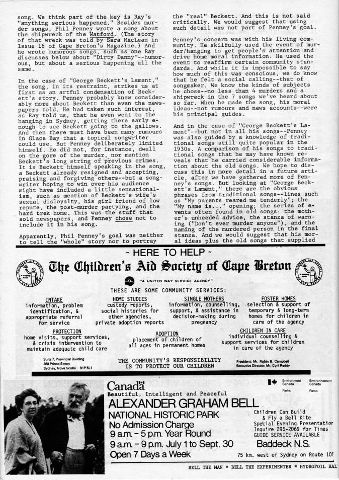 Published by Ronald Caplan on 1986/6/1 (254 reads)song. We think part of the key is Ray's "anything serious happened." Besides mur? der songs, Phil Penney wrote a song about the shipwreck of the Wat ford. (The story of that wreck was told by Sara MacLean in Issue 16 of Cape Breton's Magazine.) And he wrote humorous songs, such as one Ray discusses below about "Dirty Danny"--humor? ous, but about a serious happening all the s ame. In the case of "George Beckett's Lament," the song, in its restraint, strikes us at first as an artful condensation of Beck? ett's story. Penney probably knew consider? ably more about Beckett than even the news? papers told. He had taken such interest, as Ray told us, that he even went to the hanging in Sydney, getting there early e- nough to see Beckett going to the gallows. And then there must have been many rumours in Glace Bay that a topical songwriter could use. But Penney deliberately limited himself. He did not, for instance, dwell on the gore of the murder, nor mention Beckett's long string of previous crimes. It is Beckett himself speaking in the song, a Beckett already resigned and accepting, praising and forgiving others--but a song? writer hoping to win over his audience might have included a little sensational? ism, such as mention of Beckett's wife's sexual disloyalty, his girl friend of low repute, the post-murder partying, and the hard trek home. This was the stuff that sold newspapers, and Penney chose not to include it in his song. Apparently, Phil Penney's goal was neither to tell the "whole" story nor to portray the "real" Beckett. And this is not said critically. We would suggest that using such detail was not part of Penney's goal. Penney's concern was with his living com? munity. He skilfully used the event of mur? der/hanging to get people's attention and drive home moral information. He used the event to reaffirm certain community stan? dards. And lA'hile it is impossible to say how much of this was conscious, we do know that he felt a social calling--that of songmaker. We know the kinds of subjects he chose--no less than 4 murders and a shipwreck in the 7 songs we've heard about so far. When he made the song, his moral ideas--not rumours and news accounts--were his principal guides. And in the case of "George Beckett's La? ment"- -but not in all his songs--Penney was also guided by a knowledge of tradi? tional songs still quite popular in the 1930s. A comparison of his songs to tradi? tional songs that he may have known re? veals that he carried considerable informa? tion about the old songs. We hope to dis? cuss this in more detail in a future arti? cle, after we have gathered more of Pen? ney 's songs. But looking at "George Beck? ett's Lament," there are the obvious phrases from traditional songs--lines such as "My parents reared me tenderly"; the "My name is..." opening; the series of e- vents often found in old songs: the moth? er 's unheeded advice, the stanza of warn? ing ("Don't ever murder anyone"), and the naming of the murdered person in the final stanza. And we would suggest that his mor? al ideas plus the old songs that supplied - HERE TO HELP - Wift (Sifxlixm*B Aiii S'orietfl of (Hape l&vttan; 9 "A UNITED WAV SERVICE AGENCY" THESE ARE SOME COMMUNITY SERVICES: INTAKE information' problem identification, & appropriate referral for service PROTECTION home visits, support services, & crisis intervention to maintain adequate child care Suite 7, Provincial Building 360 Prince Street Sydney, Nova Scotia B1P 5L1 HOME STUDIES custody reports, social histories for other agencies, private adoption reports SINGLE MOTHERS information, counselling, support, & assistance in decision-making during pregnancy ADOPTION placement of children of all ages in permanent homes FOSTER HOMES selection & support of temporary & long-term homes for children in care of the agency CHILDREN IN CARE individual counselling & support services for children in care of the agency THE COMMUNITY'S RESPONSIBILITY IS TO PROTECT OUR CHILDREN President Mr. Robin B. Campbell Executive Director: Mr. Cyril Reddy Canada Beautiful, Intelligent and Peaceful ALEXANDER GRAHAM BELL NATIONAL HISTORIC PARK No Adnnission Charge 9 a.m. - 5 p.m. Year Round 9 a.m. - 9 p.m. July 1 to Sept. 30 Open 7 Days a Week I '1' Environment Environnement Canada Parks Canada Pares Children Can Build & Fly a Bell Kite Spetial Evening Presentatior Inquire 295-2069 for Times GUIDE SERVICE AVAILABLE Baddeck N.S. 75 km. west of Sydney on Route lOE BELL THE MAN * BELL THE EXPERIMENTER * HYDROFOIL HAL