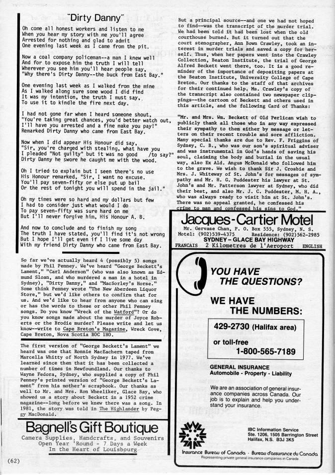 Published by Ronald Caplan on 1986/6/1 (432 reads)Dirty Danny' Oh come all honest workers and listen to me When you hear my story with me you'll agree Arrested for nothing and glad to admit One evening last week as I came from the pit. Now a coal company policeman • a man I knew well And for to expose him the truth I will tell Wherever you see him you'll hear people say, "Why there's Dirty Danny • the buck from East Bay." One evening last week as I walked from the mine As I walked along sure some wood I did find It was my intention, the truth I must say. To use it to kindle the fire next day. I had not gone far when I heard someone shout, "You're taking great chances, you'd better watch out, I'll have you arrested and a fine make you pay!" Remarked Dirty Danny who came from East Bay. Now when I did appear His Honour did say, "Sir, you're charged with stealing, what have you I pleaded "Not guilty" but it was no good /to say?" Dirty Danny he swore he caught me with the wood. Oh I tried'to explain but I seen there's no use His Honour remarked, "Sir, I want no excuse. You'll pay seven-fifty or else put up bail Or the rest of tonight you will spend in the jail." Oh my times were so hard and my dollars but few I had to consider just what would I do To pay seven-fifty was sure hard on me But I'll never forgive him, His Honour A. B. And now to conclude and to finish my song The truth I have stated, you'll find it's not wrong But I hope I'll get even if I live some day With my friend Dirty Danny who came from East Bay. So far we've actually heard 4 (possibly 5) songs made by Phil Penney. WeVe heard "George Beckett's Lament," "Carl Anderson" (who was also known as Ed? mund Sloan, and who murdered a man in a hotel in Sydney), "Dirty Danny," and "MacSorley's Horse," Some think Penney wrote "The New Aberdeen Liquor store," but we'd like others to confirm that for us. And we'd like to hear from anyone who can sing or has the words to these or other Phil Penney songs. Do you know "Wreck of the Watford"? Or do you know songs made about the murder of Joyce Rob? erts or the Brodie murder? Please write and let us know • write to Cape Breton's Magazine, Wreck Cove, Cape Breton, Nova Scotia BOC IHO. The first version of "George Beckett's Lament" we heard was one that Ronnie MacEachern taped from Marcella Whitty of North Sydney in 1977. We've learned since then that it has been collected a number of times in Newfoundland. Our thanks to Wayne Fedora, Sydney, who supplied a copy of Phil Penney's printed version of "George Beckett's La? ment" from his mother's scrapbook. Our thanks as well to Mr. and Mrs. Ron Wheeliker, Glace Bay, who showed us a story about Beckett in a 1952 crime magazine • long before we knew there was a song. In 1981, the story was told in The Highlander by Peg? gy MacDonald. Bagnell's Gift Boutique Camera Supplies, Handcrafts, and Souvenirs Open Year 'Round - 7 Days a Week In the Heart of Louisbourg But a principal source • and one we had not hoped to find • was the transcript of the murder trial. We had been told it had been lost when the old courthouse burned. But it turned out that the court stenographer, Ann Bown Crawley, took an in? terest in murder trials and saved a copy for her? self. Thus, when her papers went into the Crawley Collection, Beaton Institute, the trial of George Alfred Beckett went there, too. It is a good re? minder of the importance of depositing papers at the Beaton Institute, University College of Cape Breton, Our thanks to the staff of that archives for their continued help. Ms, Crawley's copy of the transcript also contained two newspaper clip? pings • the cartoon of Beckett and others used in this article, and the following Card of Thanks: "Mr. and Mrs. Wm. Beckett of Old Perlican wish to publicly thank all those who in any way expressed their sympathy to them either by message or let? ters on their recent trouble and sore affliction. Many special thanks are due to Rev, F, Friggins of Sydney, C, B,, who was our son's spiritual adviser and was instrumental in God's hands of saving his soul, claiming the body and burial in the usual way, also Ex Aid, Angus McDonald who followed him to the grave. We wish to thank Sir J. Crosbie and Mrs. J, Whiteway of St. John's for messages of sym? pathy and Mr, H, G, Puddester his lawyer at St, John's and Mr, Patterson lawyer at Sydney, who did their best, and also Mr, J, C, Puddester, M, H, A,, who was always ready to visit him at St. John's, There was no appeal granted, he confessed his 'jjg''cj'arj'gn'jconfessedjji'''sin Jacques-Cartier Motel Mr, Gervase Chan, P, 0, Box 555, Sydney, N. S, Motel: (902)539-4375 Residence: (902)562-2985 SYDNEY- GLACE BAY HIGHWAY FRANCAIS 2 Kilometres de I'Aeroport ENGLISH (62) YOU HAVE THE QUESTIONS? WE HAVE THE NUMBERS: 429-2730 (Halifax area) or toll-free 1-800-565-7189 GENERAL INSURANCE Automobile - Property - Liability We are an association of general insur? ance companies across Canada. Our job is to explain and help you under? stand your insurance. IrvsuroAce Bureau of Carvada • Bureau d'assurarvce du Carvada Representing private general insurance companies in Canada IBC Information Service Ste. 1206, 1505 Barrington Street Halifax, N.S. B3J 3K5