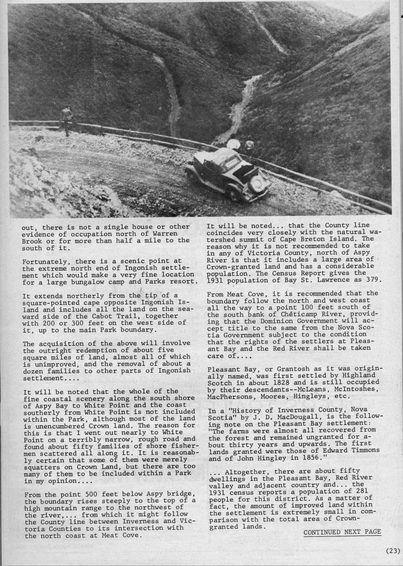out, there is not a single house or other evidence of occupation north of Warren Brook or for more than half a mile to the south of it. Fortunately, there is a scenic point at the extreme north end of Ingonish settle? ment which would make a very fine location for a large bungalow camp and Parks resort. It extends northerly from the tip of a square-pointed cape opposite Ingonish Is? land and includes all the land on the sea? ward side of the Cabot Trail, together with 200 or 300 feet on the west side of it, up to the main Park boundary. The acquisition of the above will involve the outright redemption of about five square miles of land, almost all of which is unimproved, and the removal of about a dozen families to other parts of Ingonish settlement.... It will be noted that the whole of the fine coastal scenery along the south shore of Aspy Bay to White Point and the coast southerly from White Point is not included within the Park, although most of the land is unencumbered Crown land. The reason for this is that I went out nearly to White Point on a terribly narrow, rough road and found about fifty families of shore fisher? men scattered all along it. It is reasonab? ly certain that some of them were merely squatters on Crown Land, but there are too many of them to be included within a Park in my opinion.... From the point 500 feet below Aspy bridge, the boundary rises steeply to the top of a high mountain range to the northwest of the river,... from which it might follow the County line between Inverness and Vic? toria Counties to its intersection with the north coast at Meat Cove. It will be noted... that the County line coincides very closely with the natural wa? tershed summit of Cape Breton Island. The reason why it is not recommended to take in any of Victoria County, north of Aspy River is that ,it includes a large area of Crown-granted land and has a considerable population. The Census Report gives the 1931 population of Bay St. Lawrence as 379. From Meat Cove, it is recommended that the boundary follow the north and west coast all the way to a point 100 feet south of the south bank of Cheticamp River, provid? ing that the Dominion Government will ac? cept title to the same from the Nova Sco? tia Government subject to the condition that the rights of the settlers at Pleas? ant Bay and the Red River shall be taken care of • ... Pleasant Bay, or Grantosh as it was origin? ally named, was first settled by Highland Scotch in about 1828 and is still occupied by their descendants--McLeans, Mclntoshes, MacPhersons, Moores, Hingleys, etc. In a "History of Inverness County, Nova Scotia" by J. D. MacDougall, is the follow? ing note on the Pleasant Bay settlement: "The farms were almost all recovered from the forest and remained ungranted for a- bout thirty years and upwards. The first lands granted were those of Edward Timmons and of John Hingley in 1856." ... Altogether, there are about fifty dwellings in the Pleasant Bay, Red River valley and adjacent country and... the 1931 census reports a population of 281 people for this district. As a matter of fact, the amount of improved land within the settlement is extremely small in com? parison with the total area of Crown- granted lands. CONTINUED NEXT PAGE (23)