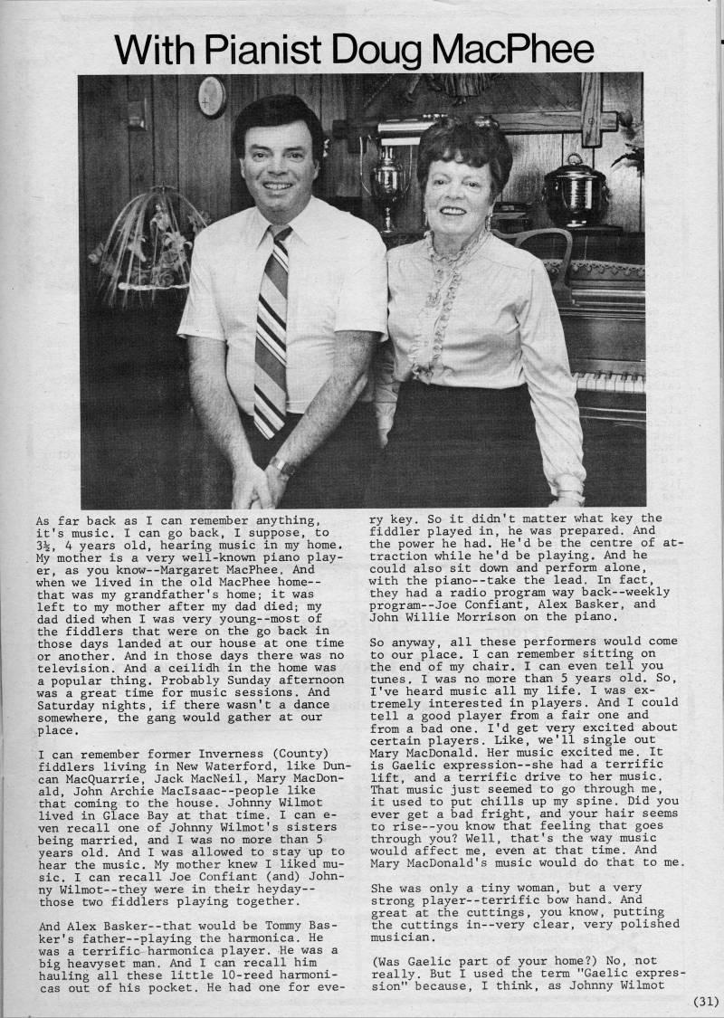 Published by Ronald Caplan on 1986/8/1 (352 reads)With Pianist Doug IVIacPhee As far back as I can remember anything, it's music. I can go back, I suppose, to 3%, 4 years old, hearing music in my home. My mother is a very well-known piano play? er, as you know--Margaret MacPhee. And when we lived in the old MacPhee home-- that was my grandfather's home; it was left to my mother after my dad died; my dad died when I was very young--most of the fiddlers that were on the go back in those days landed at our house at one time or another. And in those days there was no television. And a ceilidh in the home was a popular thing. Probably Sunday afternoon was a great time for music sessions. And Saturday nights, if there wasn't a dance somewhere, the gang would gather at our place. I can remember former Inverness (County) fiddlers living in New Waterford, like Dun? can MacQuarrie, Jack MacNeil, Mary MacDon? ald, John Archie MacIsaac--people like that coming to the house. Johnny Wilmot lived in Glace Bay at that time. I can e- ven recall one of Johnny Wilmot's sisters being married, and I was no more than 5 years old. And I was allowed to stay up to hear the music. My mother knew I liked mu? sic. I can recall Joe Confiant (and) John? ny Wilmot--they were in their heyday-- those two fiddlers playing together. And Alex Basker--that would be Tommy Bas- ker's father--playing the harmonica. He was a terrific harmonica player. He was a big heavyset man. And I can recall him hauling all these little 10-reed harmoni? cas out of his pocket. He had one for eve? ry key. So it didn't matter what key the fiddler played in, he was prepared. And the power he had. He'd be the centre of at? traction while he'd be playing. And he could also sit down and perform alone, with the piano--take the lead. In fact, they had a radio program way back--weekly program--Joe Confiant, Alex Basker, and John Willie Morrison on the piano. So anyway, all these performers would come to our place. I can remember sitting on the end of my chair. I can even tell you tunes. I was no more than 5 years old. So, I've heard music all my life. I was ex? tremely interested in players. And I could tell a good player from a fair one and from a bad one. I'd get very excited about certain players. Like, we'll single out Mary MacDonald. Her music excited me. It is Gaelic expression--she had a terrific lift, and a terrific drive to her music. That music just seemed to go through me, it used to put chills up my spine. Did you ever get a bad fright, and your hair seems to rise--you know that feeling that goes through you? Well, that's the way music would affect me, even at that time. And Mary MacDonald's music would do that to me. She was only a tiny woman, but a very strong player--terrific bow hand • And great at the cuttings, you know, putting the cuttings in--very clear, very polished musician. (Was Gaelic part of your home?) No, not really. But I used the term "Gaelic expres? sion" because, I think, as Johnny Wilmot