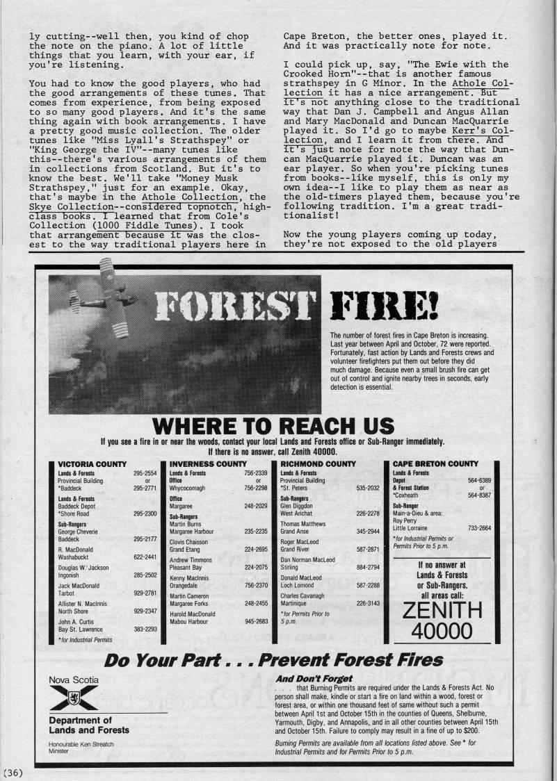 Published by Ronald Caplan on 1986/8/1 (311 reads)ly cutting--well then, you kind of chop the note on the piano. A lot of little things that you leam, with your ear, if you're listening. You had to know the good players, who had the good arrangements of these tunes. That comes from experience, from being exposed to so many good players. And it's the same thing again with book arrangements. I have a pretty good music collection. The older tunes like "Miss Lyall's Strathspey" or "King George the IV"--many tunes like this--there's various arrangements of them in collections from Scotland, But it's to know the best. We'll take "Money Musk Strathspey," just for an example. Okay, that's maybe in the Athole Collection, the Skye Collection--considered topnotch, high- class books. I learned that from Cole's Collection (1000 Fiddle Tunes), I took that arrangement because it was the clos? est to the way traditional players here in Cape Breton, the better ones, played it. And it was practically note for note, I could pick up, say, "The Ewie with the Crooked Hom"--that is another famous strathspey in G Minor. In the Athole Col? lection it has a nice arrangement. But it's not anything close to the traditional way that Dan J. Campbell and Angus Allan and Mary MacDonald and Duncan MacQuarrie played it. So I'd go to maybe Kerr's Col? lection, and I leam it from there. And it's just note for note the way that Dun? can MacQuarrie played it. Diincan was an ear player. So when you're picking tunes from books--like myself, this is only my own idea--I like to play them as near as the old-timers played them, because you're following tradition. I'm a great tradi? tionalist! Now the young players coming up today, they're not exposed to the old players FIlMi!! The number of forest fires in Cape Breton is increasing. Last year between April and October, 72 were reported. Fortunately, fast action by Lands and Forests crews and volunteer firefighters put them out before they did much damage. Because even a small brush fire can get out of control and ignite nearby trees in seconds, early detection is essential. If you s VICTORIA COUNTY Lands & Forests Provincial Building *Baddeck Lands & Fomsts Baddeck Depot *Shore Road Sub-Rangers George Cheverie Baddeck R. MacDonald Washabuckt Douglas W. Jackson Ingonish Jack MacDonald Tarbot Allister N. Maclnnis North Shore John A. Curtis Bay St. Lawrence *for Industrial Permits WHERE TO REACH US e a fire in or near the woods, contact your local If there is no answer, INVERNESS COUNTY Lands & Forests 756-2339 Lands and Forests office or Sub-Ranger immediately, call Zenith 40000. 295'2177 622-2441 285-2502 929-2781 929-2347 383-2293 Whycocomagh Office Margaree Sub-Rangers Martin Burns Margaree Harbour Clovis Chaisson Grand Etang Andrew Timmons Pleasant Bay Kenny Maclnnis Orangedale Martin Cameron Margaree Forks Harold MacDonald Mabou Harbour 248-2029 235-2235 224-2695 224-2075 756-2370 248-2455 945-2683 RICHMOND COUNTY Lands & Forests Provincial Building *St. Peters 53 Sub-Rangers Glen Diggdon West Arichat 22 Thomas Matthews Grand Anse 34 Roger MacLeod Grand River 58 Dan Norman MacLeod Stirling 88 Donald MacLeod Loch Lomond 58 Charles Cavanagh Martinique 22 * for Permits Prior to 5 p.m. CAPE BRETON COUNTY Lands & Forests Depot 564-63 & Forest Station or "Coxheath 564-82 Sub-Ranger Main-a-Dieu & area: Roy Perry Little Lorraine 733-26 *for Industrial Permits or Permits Prior to 5 p.m. If no answer at Lands & Forests or Sub-Rangers, all areas call: ZENITH 40000 Do Your Part... Provent Forest Fires Nova Scotia liC Department of Lands and Forests And Dont Forget . . . that Burning Permits are required under the Lands & Forests Act. No person shall make, kindle or start a fire on land within a wood, forest or forest area, or within one thousand feet of same without such a permit between April 1st and October 15th in the counties of Queens, Shelburne, Yarmouth, Digby, and Annapolis, and in all other counties between April 15th and October 15th. Failure to comply may result in a fine of up to $200. Burning Permits are available from all locations listed above. See * for Industrial Permits and for Permits Prior to 5 p.m.