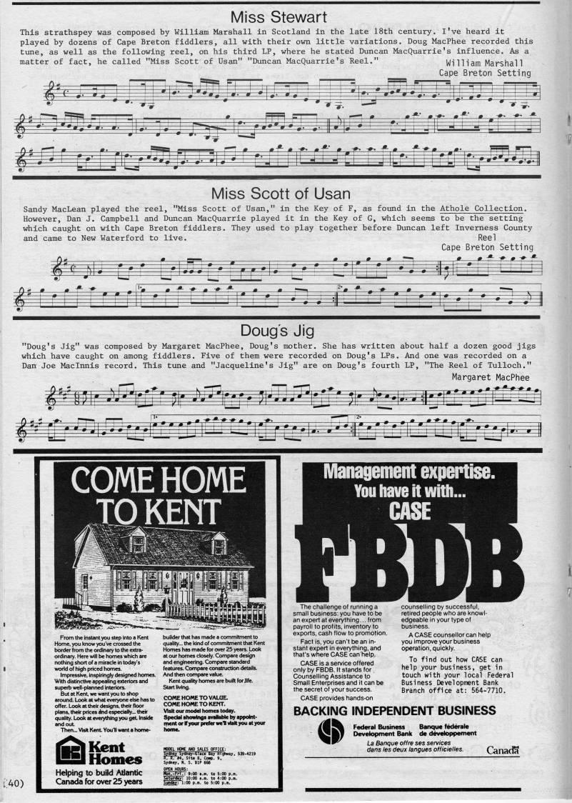 Miss Stewart This strathspey was composed by William Marshall in Scotland in the late 18th century. I've heard it played by dozens of Cape Breton fiddlers, all with their own little variations. Doug MacPhee recorded this tune, as well as the following reel, on his third LP, where he stated Duncan MacQuarrie's influence. As a matter of fact, he called "Miss Scott of Usan" "Duncan MacQuarrie's Reel." William Marshall Cape Breton Setting IVIiss Scott of Usan Sandy MacLean played the reel, "Miss Scott of Usan," in the Key of F, as found in the Athole Collection. However, Dan J. Campbell and Duncan MacQuarrie played it in the Key of G, which seems to be the setting which caught on with Cape Breton fiddlers. They used to play together before Duncan left Inverness County and came to New Waterford to live. Reel Cape Breton Setting Doug's Jig "Doug's Jig" was composed by Margaret MacPhee, Doug's mother. She has written about half a dozen good jigs which have caught on among fiddlers. Five of them were recorded on Doug's LPs. And one was recorded on a Dan Joe Maclnnis record. This tune and "Jacqueline's Jig" are on Doug's fourth LP, "The Reel of Tulloch." Margaret MacPhee t.40) COME HOME TO KENT From th? instant you step into a Kent Home, you l