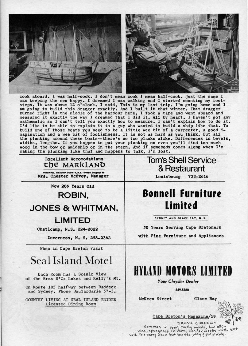 Published by Ronald Caplan on 1974/6/1 (754 reads)cook aboard. I was half-cook. I don't mean cook I mean half-cook. Just the same I was keeping the men happy. I dreamed I was walking and I started counting my foot? steps. It was about 12 o'clock. I said. This is my last trip. I'm going home and I am going to build this dragger exactly. And I built it that winter. That dragger burned right in the middle of the harbour here. I took a tape and went aboard and measured it exactly the way I dreamed that I did it. All by heart. I haven't got any mathematic so I can't tell you exactly how to measure. I can't explain how to do it. I'd like to be able to explain it to a guy who wanted to build a ship like that. To build one of those boats you need to be a little wee bit of a carpenter, a good i- magination and a wee bit of foolishness. It is not as hard as you think. But all the planking around these boats • there's no two planks alike. Differences in bevels, widths, lengths. If you happen to put your planking on even you'll find too much wood in the bow or amidship or in the stern. And if somebody comes along when I'm making the planking like that and happens to talk, I'm lost. Excellent Accomodations x:he MAKklANb DINGWALL. VICTORIA COUHTY, N.S. • PhOflK Olngw?H 4? Mrs. Chester McEvoy, Manager Now 206 Years Old ROBIN, JONES & WHITMAN, LIMITED Cheticamp, N.S. 224-2022 Inverness, N, S, 258-2362 When in Cape Breton Visit Seal Island Motel Each Room has a Scenic View of the Bras D'Or Lakes and Kelly's Mt. On Route 105 halfway between Baddeck and Sydney. Phone Boulardarie 57-3. COUNTRY LIVING AT SEAL ISLAND BRIDGE Licensed Dining Room Tom's Shell Service & Restaurant Louislx)urg 733-2616 Bonnell Furniture Limited SYDNEY AND GLACE BAY, N. S. 50 Years Serving Cape Bretoners with Fine Furniture and Appliances HmniD HOraUIHITED Your Chrysler Dealer 849-5588 McKeen Street Glace Bay Cape Breton's Maga2ine/19