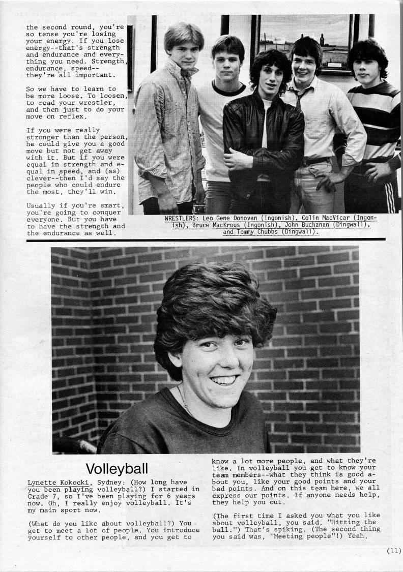 Published by Ronald Caplan on 1987/1/1 (408 reads)the second round, you're so tense you're losing your energy. If you lose energy--that's strength and endurance and every? thing you need. Strength endurance, speed-- they're all important. So we have to leam to be more loose. To loosen, to read your wrestler, and then just to do your # move on reflex. If you were really stronger than the person, he could give you a good move but not get away with it, But if you were equal in strength and e- qual in 'speed, and (as) clever--then I'd say the people who could endure the most, they'll win. Usually if you're smart, you're going to conquer everyone. But you have to have the strength and the endurance as well. WRESTLERS: Leo Gene Donovan (Ingonish), Colin MacVicar (Inqon- ish), Bruce MacKrous (Ingonish), John Buchanan (DingwallJT and Tommy Chubbs (Dingwall). Volleyball Lynette Kokocki, Sydney: (How long have you been playing volleyball?) I started in Grade 7, so I've been playing for 6 years now. Oh, I really enjoy volleyball. It's my main sport now. (What do you like about volleyball?) You - get to meet a lot of people. You introduce yourself to other people, and you get to know a lot more people, and what they're like. In volleyball you get to know your team members--what they think is good a- bout you, like your good points and your bad points. And on this team here, we all express our points. If anyone needs help, they help you out. (The first time I asked you what you like about volleyball, you said, "Hitting the ball.") That's spiking, (The second thing you said was, "Meeting people"!) Yeah, (11)