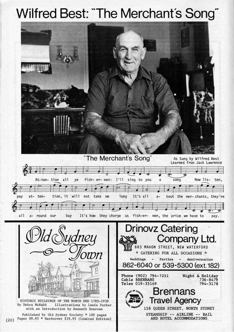 Published by Ronald Caplan on 1987/1/1 (246 reads)Wilfred Best: The Merchant's Song' 'The Merchant's Song" As Sung by Wilfred Best Learned from Jack Lawrence At-ten- tion all ye fish- er- men: I'll sing to you a song Now lis- ten. pay at- ten- tion, it will not take me long It's all a- bout the mer-chants, they're all a- round our bay It's how they charge us fish-er- men, the price we have to pay. HISTORIC BUILDINGS OF THE NORTH END 1785-1938 By Debra McNabb Illustrations by Lewis Parker with an Introduction by Kenneth Donovan Published by Old Sydney Society * 100 pages (20) ''P'' $9.95 * Hardcover $19.95 (Limited Edition) Drinovz Catering Company Ltd. 683 MAHON STREET, NEW WATERFORD * CATERING FOR ALL OCCASIONS * Weddings - Parties - Anniversaries 862-6040 or 539-5300 (ext. 182) Phone (902) 794-7251 Cable BRENNANS Telex 019-35149 Night & Holiday 736-8479 794-3178 ' • O' Brennans %fSlij Travel Agency <4S80C*' 158 QUEEN STREET, NORTH SYDNEY STEAMSHIP • AIRLINE -- RAIL AND HOTEL ACCOMMODATIONS,