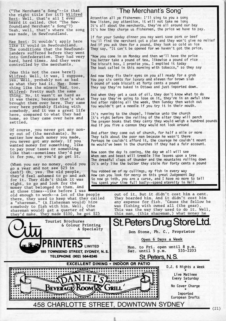 Published by Ronald Caplan on 1987/1/1 (255 reads)("The Merchant's Song"--is that the right title for it?) Wilfred Best: Well, that's all I ever heard it called. (Not "The New? foundland Merchant's Song"?) Yeah, well, that's where the song was made, in Newfoundland. Mae Best: It wouldn't apply here like it would in Newfoundland. The conditions that the Newfound? landers suffered before they went into Confederation. They had very hard, hard times. And they were controlled by the merchants. (Was this not the case here?) Wilfred: Well, it was, I suppose, yes. Well, probably not as bad as what they had it. Mae: Some? thing like the miners had, too. Wilfred: Pretty much the same thing. No, it wasn't as hard as it was there, because that's what brought them over here. They came over here probably fishing with somebody, and it was a great life here, compared to what they had home, so they came over here and settled. Of course, you never got any mon? ey out of (the merchants). No matter how much money you made, you never got any money. If you wanted money for something, like to pay your taxes or something like that--sometimes they'd pay it for you, or you'd go get it. (When you say no money, could you go a year and not see $25 in cash?) Oh, yes. The old people, they'd feel ashamed to go and ask for it. They didn't think it was right, to go and look for the money that belonged to them. And at those times--like before I was old enough to work--a lot of the people there, they used to keep what they called a "shareman." (A fisherman would) hire somebody to fish with him. Well, (the shareman would) get a quarter of what they'd make. They made $100, he got $25 "The Merchant's Song" Attention all ye fishermen: I'll sing to you a song Now listen, pay attention, it will not take me long It's all about the merchants, they're all around our bay It's how they charge us fishermen, the price we have to pay. If for your Sunday dinner you may want some pork or beef You'll find the merchant got a plan and they won't give no relief And if you ask them for a pound, they look so cold as ice They say, "It can't be opened for we haven't got the price. "Now you come in on Monday and then we'll have the price You better take a pound of tea, likewise a pound of rice The biscuit box, I promise you, I emptied it today The boat called in this morning with tobacco," so they say And now they fix their eyes on you all ready for a grab You pay six cents for luxury and eleven for brown slab A pound of soda biscuit at forty cents a pound They say they're baked in Ottawa and just imported down. And when they get a cask of oil, they don't know what to do They say they're going to lose on it, they're in an awful stew And after robbing all the week, then Sunday then watch out You wouldn't get a needle if you try it in their mouth. It's running to the chapel, likewise unto the church It's right before the railing of the altar they will perch The prayer books that they carry they would weigh a hundred pounds And if you fire a cannon they would not look around And after they come out of church, for half a mile or more They talk about the poor man because he wasn't there Perhaps he couldn't afford it, the courage he couldn't mount He would've been in the churches if they had a fair account. Now soon the day is coming, the day we all will see When men and beast will tremble like leaves upon a tree The dreadful claps of thunder and the mountains rolling down It's only like the butter they stole for forty cents a pound You robbed me of my cullings, my fish in every way How can you look for mercy on this great Judgement Day So now go inth, you are a curse, and I have no more to tell You spent your time full badly--spend eternity in Hell. e' e' out of it. But it didn't cost him a cent. They boarded him. And it didn't cost him any expense for fish. 'Cause the fellow he was fishing with owned all (the gear). This was the way they used to do it. Well, this man, (this shareman,) what money he Tourist Brochures & Colour Printing A Specialty PRINTERS, 180 TOWNSEND STREET, SYDNEY, N. S. TELEPHONE (902) 564'245 St. Peters Drug Store Ltd. Don Stone, Ph. C., Proprietor Open 6 Days a Week Mon. to Fri. open until 8 p.m. Sat. until 5 p.m. 535-2203 St. Peters, N.S. ' EXCELLENT DINING ?> INDOOR OR PATIO D.J. 6 Nights a Week * Live Matinee Every Saturday * No Cover Charge Imported European Drafts 458 CHARLOTTE STREET, DOWNTOWN SYDNEY (21)