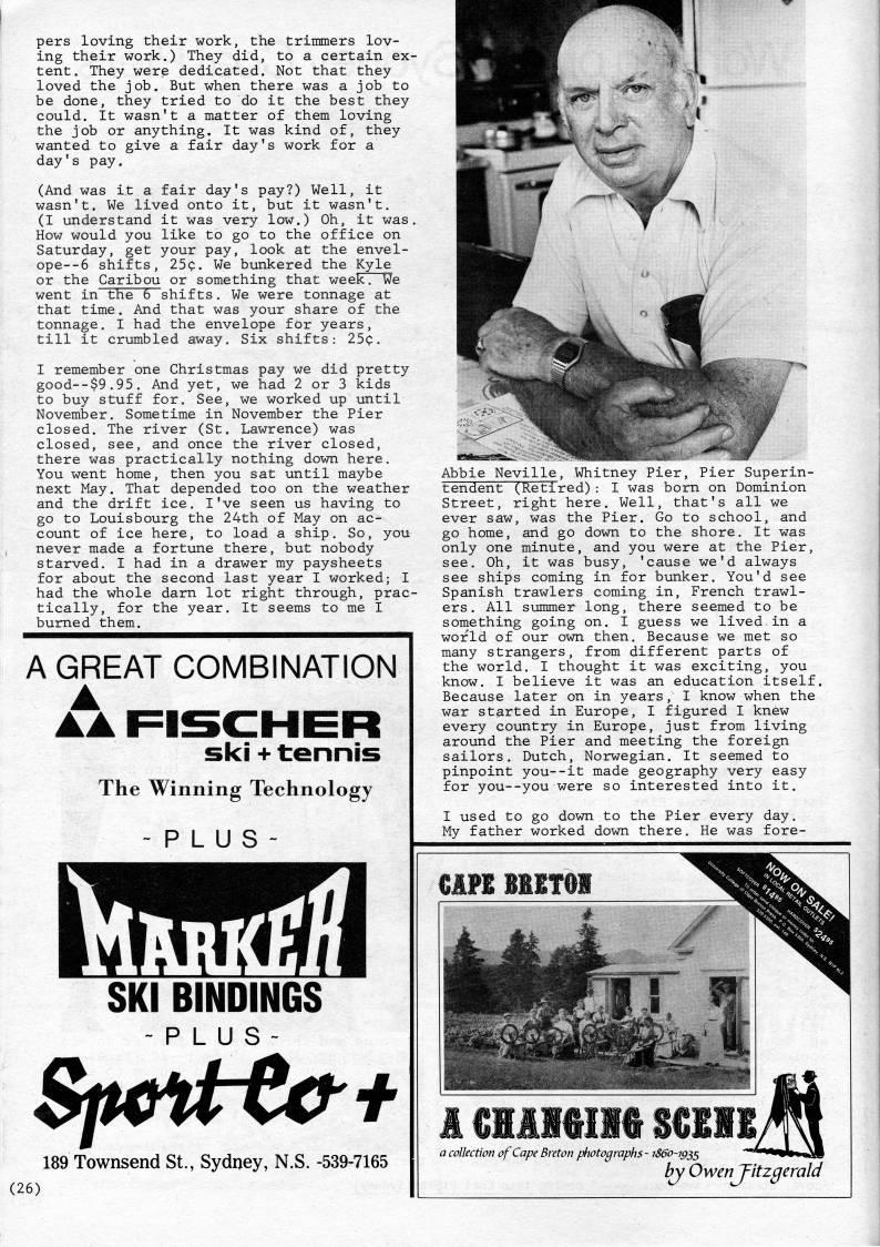 Published by Ronald Caplan on 1987/1/1 (316 reads)pers loving their work, the trimmers lov? ing their work.) They did, to a certain ex? tent. They were dedicated. Not that they loved the job. But when there was a job to be done, they tried to do it the best they could. It wasn't a matter of them loving the job or anything. It was kind of, they wanted to give a fair day's work for a day's pay. (And was it a fair day's pay?) Well, it wasn't. We lived onto it, but it wasn't. (I understand it was very low.) Oh, it was. How would you like to go to the office on Saturday, get your pay, look at the envel- ope--6 shifts, 25c. We bunkered the Kyle or the Caribou or something that week. We went in the 6 shifts. We were tonnage at that time. And that was your share of the tonnage. I had the envelope for years, till it crumbled away. Six shifts: 25c. I remember one Christmas pay we did pretty good--$9.95. And yet, we had 2 or 3 kids to buy stuff for. See, we worked up until November. Sometime in November the Pier closed. The river (St. Lawrence) was closed, see, and once the river closed, there was practically nothing down here. You went home, then you sat until maybe next May. That depended too on the weather and the drift ice. I've seen us having to go to Louisbourg the 24th of May on ac? count of ice here, to load a ship. So, you never made a fortune there, but nobody starved. I had in a drawer my paysheets for about the second last year I worked; I had the whole darn lot right through, prac? tically, for the year. It seems to me I burned them. A GREAT COMBINATION ski + tennis The Winning Technology -PLUS- SKI BINDINGS -PLUS- 189 Townsend St., Sydney, N.S. -539-7165 (26) Abbie Neville, Whitney Pier, Pier Superin- tendent (Retired): I was born on Dominion Street, right here. Well, that's all we ever saw, was the Pier. Go to school, and go home, and go down to the shore. It was only one minute, and you were at the Pier, see. Oh, it was busy, 'cause we'd always see ships coming in for bunker. You'd see Spanish trawlers coming in, French trawl? ers. All summer long, there seemed to be something going on. I guess we lived.in a world of our own then. Because we met so many strangers, from different parts of the world. I thought it was exciting, you know. I believe it was an education itself. Because later on in years, I know when the war started in Europe, I figured I knew every country in Europe, just from living around the Pier and meeting the foreign sailors. Dutch, Norwegian. It seemed to pinpoint you--it made geography very easy for you--you were so interested into it. I used to go down to the Pier every day. My father worked down there. He was fore- CAPE BSSTOI iiIlAflwlliw o%mn?? a collection of Cape Breton photographs - i86o~ig'' ' • ' by OwenTitzgerald