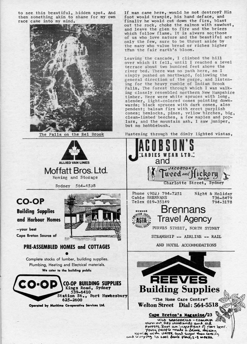Published by Ronald Caplan on 1974/6/1 (827 reads)to see this beautiful, hidden spot. And then something akin to shame for my own race came into my mind. The Falls on the Eel Brook If man came here, would he not destroy? His foot would trample, his hand deface, and finally he would cut down the firs, blast out the rock, choke the salmon with sawdust, and leave the glen to fire and the briers which follow flame. It is always so;those of us who love nature and the beautiful are only the few, sure to be thrust aside by the many who value bread or riches higher tlTan the fair earth's bloom. Leaving the cascade, I climbed the hill over which it fell, until I reached a level terrace about two hundred feet above the river bed. There was no path here, so I simply pushed on northward, following the general direction of the gorge, and listen? ing for the heavy rumble of Indian Brook Falls. The forest through which I was walk? ing closely resembled northern New Hampshire timber. Here were white spruces with long, slender, light-colored cones pointing down? wards; black spruces with dark cones, also pendent; balsam firs with erect purplish cones; hemlocks, pines, yellow birches, big, clean-limbed beeches, a few maples and pop? lars, and the mountain ash. I saw juniper, but no hobblebush. Hastening through the dimly lighted vistas. ALLIED VAN LINES Moffatt Bros. Ltd. Moving and Storage Sydney 564-4538 CO-OP Building Sufipiies and Harbour Homes • your best Cape Breton Source of PRE-ASSEMBLED HOMES and COHAGES • Complete stocks of lumber, building supplies. Plumbing, Heating and Electrical materials. We cater to the building public CO-OP J ACOBSON'S LADIES WEAR LTD.! and Charlotte Street, Sydney Phone (.902> 794-7251 Cable BRENNANS Telex 019-35149 Night & Holiday 736-8479 794-3178 ...... Brennans MM Travel Agency 'mit' PURVES STREET, NORTH SYDNEY STEAMSHIP • AIRLINE • RAIL AND HOTEL ACCOMMODATIONS UO-DP BUILDING SUPPLIES Kings Road, Sydney 539-6410 Station St??, Port Hawkesbury 625-2600 Operated by Maritime Co-operative Services Ud. Building Supplies "The Home Care Centre" Welton Street Dial: 564-5518 Cape Breton's HuLTine/23 yo