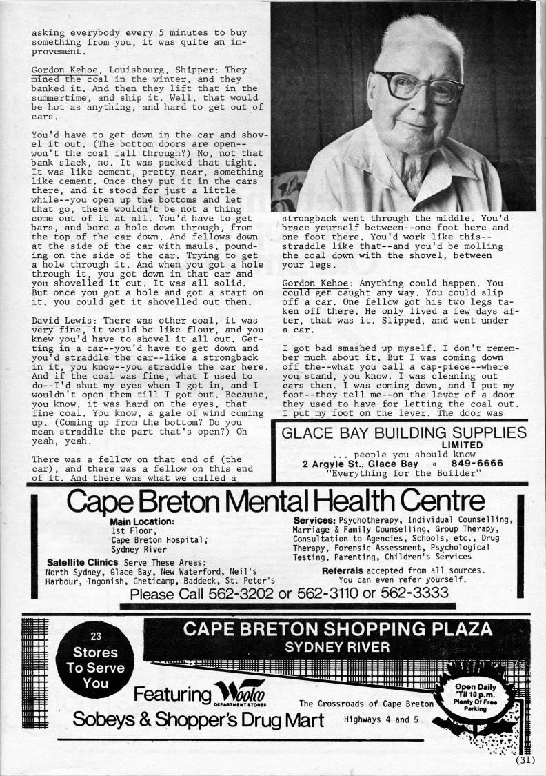 Published by Ronald Caplan on 1987/1/1 (254 reads)asking everybody every 5 minutes to buy something from you, it was quite an im? provement . Gordon Kehoe, Louisbourg, Shipper: They mined the coal in the winter, and they banked it. And then they lift that in the summertime, and ship it. Well, that would be hot as anything, and hard to get out of cars. You'd have to get down in the car and shov? el it out. (The bottom doors are open-- won't the coal fall through?) No, not that bank slack, no. It was packed that tight. It was like cement, pretty near, something like cement. Once they put it in the cars there, and it stood for just a little while--you open up the bottoms and let that go, there wouldn't be not a thing come out of it at all. You'd have to get bars, and bore a hole down through, from the top of the car down. And fellows down at the side of the car with mauls, pound? ing on the side of the car. Trying to get a hole through it. And when you got a hole through it, you got down in that car and you shovelled it out. It was all solid. But once you got a hole and got a start on it, you could get it shovelled out then. David Lewis: There was other coal, it was very fine, it would be like flour, and you knew you'd have to shovel it all out. Get? ting in a car--you'd have to get down and you'd straddle the car--like a strongback in it, you know--you straddle the car here. And if the coal was fine, what I used to do--I'd shut my eyes when I got in, and I wouldn't open them till I got out. Because, you know, it was hard on the eyes, that fine coal. You know, a gale of wind coming up. (Coming up from the bottom? Do you mean straddle the part that's open?) Oh yeah, yeah. There was a fellow on that end of (the car), and there was a fellow on this end of it. And there was what we called a strongback went through the middle. You'd brace yourself between--one foot here and one foot there. You'd work like this-- straddle like that--and you'd be moiling the coal down with the shovel, between your legs. Gordon Kehoe: Anything could happen. You could get caught any way. You could slip off a car. One fellow got his two legs ta? ken off there. He only lived a few days af? ter, that was it. Slipped, and went under a car. I got bad smashed up myself. I don't remem? ber much about it. But I was coming down off the--what you call a cap-piece--where you stand, you know. I was cleaning out cars then. I was coming down, and I put my foot--they tell me--on the lever of a door they used to have for letting the coal out, I put my foot on the lever. The door was GLACE BAY BUILDING SUPPLIES LIMITED • ,. people you should know 2 Argyle St., Glace Bay <> 849-6666 "Everything for the Builder" Cape Breton Mental Health Centre Main Location: 1st Floor, Cape Breton Hospital,' Sydney River Satellite Clinics Serve These Areas: North Sydney, Glace Bay, New Waterford, Harbour, Ingonish, Cheticamp, Baddeck, Neil's St. Peter's Services: Psychotherapy, Individual Counselling, Marriage & Family Counselling, Group Therapy, Consultation to Agencies, Schools, etc.. Drug Therapy, Forensic Assessment, Psychological Testing, Parenting, Children's Services Referrals accepted from all sources. You can even refer yourself. Please Call 562-3202 or 562-3110 or 562-3333 Stores To Serve You CAPE BRETON SHOPPING PLAZA SYDNEY RIVER Um' Featuring AWfl? OCPARTMf NT tTONCt The Crossroads of Cape Breton' Sobeys & Shopper's Drug Mart ?'9hways 4 and s en Daily il 10 p.m. (31)