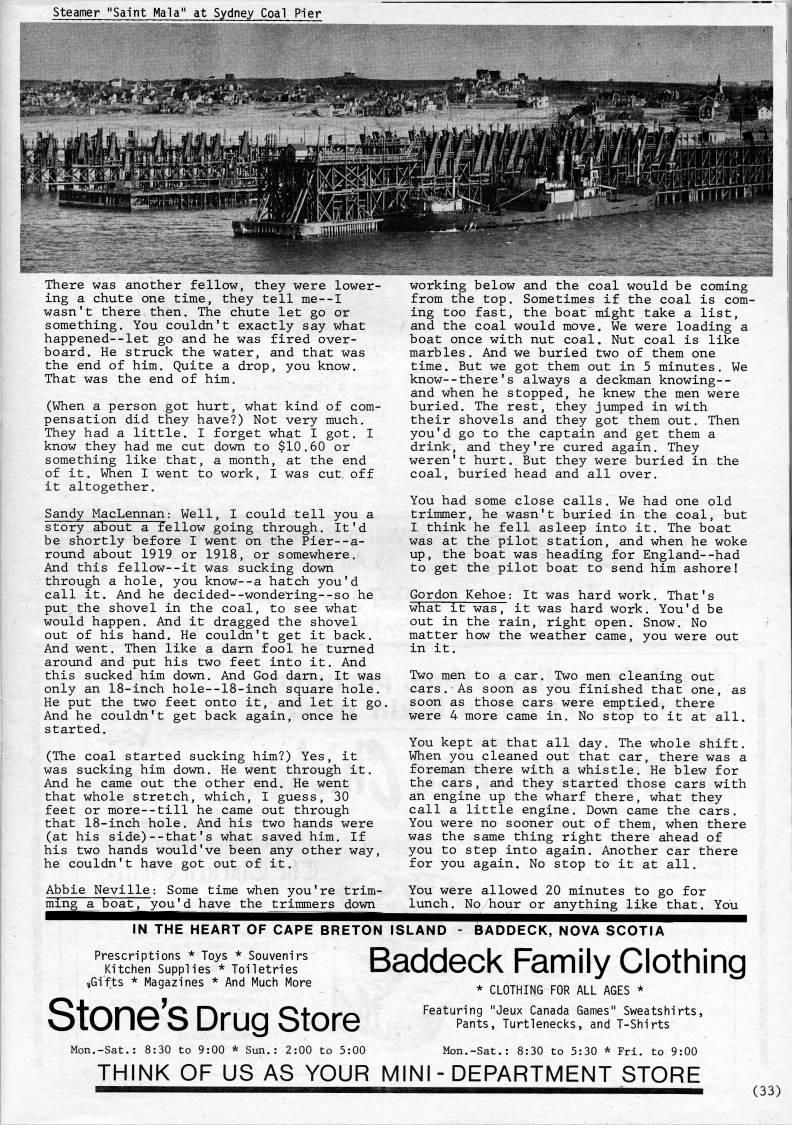 Published by Ronald Caplan on 1987/1/1 (382 reads)steamer "Saint Mala" at Sydney Coal Pier There was another fellow, they were lower? ing a chute one time, they tell me--I wasn't there then. The chute let go or something. You couldn't exactly say what happened--let go and he was fired over? board. He struck the water, and that was the end of him. Quite a drop, you know. That was the end of him. (When a person got hurt, what kind of com? pensation did they have?) Not very much. They had a little. I forget what I got. I know they had me cut down to $10.60 or something like that, a month, at the end of it. When I went to work, I was cut, off it altogether, Sandy MacLennan: Well, I could tell you a story about a fellow going through. It'd be shortly before I went on the Pier--a- round about 1919 or 1918, or somewhere. And this fellow--it was sucking down through a hole, you know--a hatch you'd call it. And he decided--wondering--so he put the shovel in the coal, to see what would happen. And it dragged the shovel out of his hand. He couldn't get it back. And went. Then like a darn fool he turned around and put his two feet into it. And this sucked him down. And God dam. It was only an 18-inch hole--18-inch square hole. He put the two feet onto it, and let it go. And he couldn't get back again, once he started. (The coal started sucking him?) Yes, it was sucking him down. He went through it. And he came out the other end. He went that whole stretch, which, I guess, 30 feet or more--till he came out through that 18-inch hole. And his two hands were (at his side)--that's what saved him. If his two hands would've been any other way, he couldn't have got out of it. Abbie Neville: Some time when you're trim- ming a boat, you'd have the trimmers down working below and the coal would be coming from the top. Sometimes if the coal is com? ing too fast, the boat might take a list, and the coal would move. We were loading a boat once with nut coal. Nut coal is like marbles. And we buried two of them one time. But we got them out in 5 minutes. We know--there's always a deckman knowing-- and when he stopped, he knew the men were buried. The rest, they jumped in with their shovels and they got them out. Then you'd go to the captain and get them a drink, and they're cured again. They weren't hurt.. But they were buried in the coal, buried head and all over. You had some close calls. We had one old trimmer, he wasn't buried in the coal, but I think he fell asleep into it. The boat was at the pilot station, and when he woke up, the boat was heading for England--had to get the pilot boat to send him ashore! Gordon Kehoe: It was hard work. That's what it was, it was hard work. You'd be out in the rain, right open. Snow. No matter how the weather came, you were out in it. Two men to a car. Two men cleaning out cars. As soon as you finished that one, as soon as those cars were emptied, there were 4 more came in. No stop to it at all. You kept at that all day. The whole shift. When you cleaned out that car, there was a foreman there with a whistle. He blew for the cars, and they started those cars with an engine up the wharf there, what they call a little engine. Down came the cars. You were no sooner out of them, when there was the same thing right there ahead of you to step into again. Another car there for you again. No stop to it at all. You were allowed 20 minutes to go for lunch. No hour or anything like that. You IN THE HEART OF CAPE BRETON ISLAND - BADDECK, NOVA SCOTIA Prescriptions * Toys * Souvenirs Kitchen Supplies * Toiletries ,Gifts * Magazines * And Much More Stone's Drug store Mon.-Sat.: 8:30 to 9:00 * Sun.: 2:00 to 5:00 Baddeck Family Clothing * CLOTHING FOR ALL AGES * Featuring "Jeux Canada Games" Sweatshirts, Pants, Turtlenecks, and T-Shirts Mon.-Sat.: 8:30 to 5:30 * Fri. to 9:00 THINK OF US AS YOUR MINI - DEPARTMENT STORE (33)