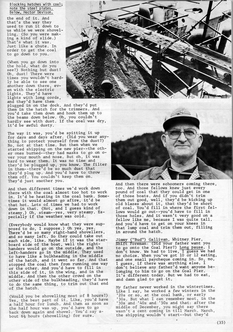 Published by Ronald Caplan on 1987/1/1 (297 reads)Blocking hatches with coal; note the steel plates. Below, Hector Devison. the end of it. And that's the way they used to run it down to us while we were shovel? ling. (So you were mak? ing a kind of slide.) That's what it was. Just like a chute. In order to get the coal to go down to you. (When you go down into the hold, what do you see?) Nothing but dust! Oh, dust! There were times you wouldn't hard ly be able to see one another down there, ev? en with the electric lights. They'd have lights with long cords, and they'd have them plugged in on the dock. And they'd put them in the hatch for the trimmers. And you'd take them down and hook them up to the beams down below. Oh, you couldn't hardly see with dust. If the coal was dry, it'd be awful dusty. The way it was, you'd be spitting it up for days and days after. (Did you wear any? thing to protect yourself from the dust?) No, not at that time. But then when we started shipping on the new pier--the oth? er ones burned--they had masks to go on o- ver your mouth and nose. But oh, it was hard to wear them. It was no time and they'd be plugged up, you know. The filter in them--there'd be so much dust that they'd plug up. And you'd have to throw them off. You couldn't keep them on. They'd just smother you. And then different times we'd work down there with the coal almost too hot to work in. It'd be heating in the coal bank. Some? times it would almost go afire, it'd be that hot, Lots of times we had to work down in that. (Hot, and I guess kind of steamy.) Oh, steam--yes, very steamy. Es? pecially if the weather was cold. (Everybody would know what they were sup? posed to do, I suppose.) Oh yes, yes. There'd be so many right-hand shovellers, and so many left. So they could take out each side, like. Maybe if it was the star? board side of the boat, well the right? handers would go on the outside, and the left-handers go in the middle. They used to have like a bulkheading in the middle of the hatch, and it went so far. And that stopped the coal then from running one way or the other. And you'd have to fill in this side of it, in the wing, and in the middle. And then the other crowd on the other side of the bulkheading, they'd have to do the same thing, to trim out that end of the hatch. (Would you be shovelling most of 8 hours?) Yes, the best part of it. Like, you'd have a half hour for lunch. And then as soon as the half hour was up, you'd have to go back down again and shovel. You'd say a- bout 6% hours (shovelling) for sure. And then there were schooners coming there, too. And those fellows knew just every pound of coal that they could get in one of those boats. And if you didn't trim them out good, well, they'd be kicking up old blazes about it, that they'd be short of coal. You'd fill in where the first fel? lows would go out--you'd have to fill in those holes. And it wasn't very good on a fellow like me, because I was quite tall. And you'd have to get on your knees in that lump coal and trim them out, filling in around the hatch. Jimmy ("Bud") Gallivan, Whitney Pier, Shift Foreman: (Did your father want you to go onto the Coal Pier?) Long pause. I don't know. We had to live, I guess we had no choice. When you've got 10 or 12 eating, and one small paycheque coming in. So, no, I guess, if there was anything else. I don't believe any father'd want anyone be? longing to him to go on the Coal Pier. It's different today. But we had to eat, and damn glad to get it. My father never worked in the wintertimes. Like I say, he worked a few winters in the '20s or so, at the coal bank, or early '30s. But what I can remember most, in the '30s and '40s and '50s and that: after the middle of December, you might say there wasn't a cent coming in till March. March, the shipping wouldn't start--but they'd (35)