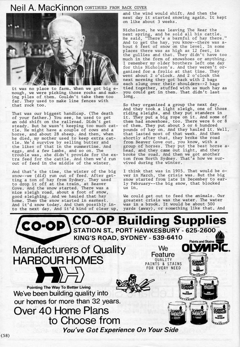 NgII a. MscKinnon continued from back cover and the wind would shift. And then the next day it started snowing again. It kept on like about 3 weeks. Nicholson, he was leaving The Rear the next spring, and he sold all his cattle. He said, "There's a barnful of hay there," And to get the hay, you know--there was a- bout 6 feet of snow on the level. In some places there was as high as 12 feet, in the gullies and that. They didn't have too much in the form of snowshoes or anything, I remember my older brothers left one day for this Nicholson's, And they weren't or? ganized for a frolic at that time. They went about 2 o'clock. And 2 o'clock the next morning they got back with 2 bags each slung over their shoulders--2 bags tied together, stuffed with as much hay as you could get in them. That didn't last long. So they organized a group the next day. And they took a light sleigh, one of those riding sleighs, and they put standers in it. They put a big rope on it. And some of them had snowshoes, too. There were 6 or 8 of them. They put about 5 or 6 hundred pounds of hay on. And they hauled it. Well, that lasted most of that week. And then shortly after that, they broke the road from Beaver Cove out, you know, with a group of horses. They put the best horse a- head, and they came out light, and they broke the road. And then we got another ton from North Sydney. That's how we sur? vived during the winter. I think that was in 1905, That would be o- ver in March, the crisis was. But the big snow started from late in December to ear? ly February--the big snow, that blocked us in. We could get out to feed the animals. Our greatest crisis was the water. The water was in a brook. It would be about 500 yards (away), or something like that. And it was no place to farm. When we got big e- nough, we were picking those rocks and mak? ing piles of them. Couldn't take them too far. They used to make line fences with that rock too. That was our biggest handicap, (The death of your father.) You see, he used to get an odd shift on the railroad. Didn't get steady. But he wasn't keeping too much cat? tle. He might have a couple of cows and a horse, and about 28 sheep. And then, when he died, my mother used to keep extra cat? tle. We'd survive by selling butter and the likes of that in the summertime. And eggs, and a few lambs, and so on. The trouble was, she didn't provide for the ex? tra feed for the cattle. And then we'd run out of feed in the middle of the winter. And that's the time, the winter of the big snow--we (did) run out of feed. After get? ting a ton of hay from Sydney, They used to drop it off at the train, at Beaver Cove, And the snow started. There was a nice sleigh road, about a foot of snow, good sleighing. And we hauled that hay home. Then the snow started in earnest. And it'd snow today. And then possibly in? to the next day. And it'd kind of clear up. CT'TTN CO-OP Building Supplies '' '/f STATION ST., PORT HAWKESBURY - 625-2600. KING'S ROAD, SYDNEY - 539-6410 Manufacturers of Quality HARBOUR HOMES Paints and Stains ' MIH) We Feature QUALITY PAINTS & STAINS FOR EVERY NEED Pointing The Way To Better Living We've been building quality into our homes for more than 32 years. Over 40 Home Plans to Choose from (58) You've Got Experience On Your Side