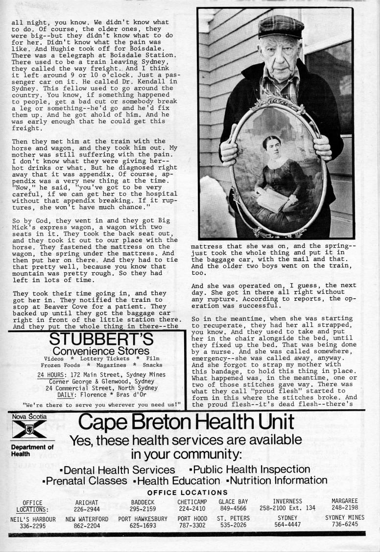Published by Ronald Caplan on 1987/1/1 (216 reads)all night, you know. We didn't know what to do. Of course, the older ones, they were big--but they didn't know what to do for her. Didn't know what the pain was like. And Hughie took off for Boisdale. There was a telegraph at Boisdale Station. There used to be a train leaving Sydney, they called the way freight. And I think it left around 9 or 10 o'clock. Just a pas? senger car on it. He called Dr. Kendall in Sydney. This fellow used to go around the country. You know, if something happened to people, get a bad cut or somebody break a leg or something--he'd go and he'd fix them up. And he got ahold of him. And he was early enough that he could get this freight. Then they met him at the train with the horse and wagon, and they took him out. My mother was still suffering with the pain. I don't know what they were giving her-- hot drinks or what. But he diagnosed right away that it was appendix. Of course, ap? pendix was a very new thing at the time. "Now," he said, "you've got to be very careful, if we can get her to the hospital without that appendix breaking.. If it rup? tures, she won't have much chance." So by God, they went in and they got Big Mick's express wagon, a wagon with two seats in it. They took the back seat out, and they took it out to our place with the horse. They fastened the mattress on the wagon, the spring under the mattress. And then put her on there. And they had to tie that pretty well, because you know that mountain was pretty rough. So they had left in lots of time. They took their time going in, and they got her in. They notified the train to stop at Beaver Cove for a patient. They backed up until they got the baggage car right in front of the little station there. And they put the whole thing in there--the STUBBERT'S Convenience Stores Videos * Lottery Tickets * Film Frozen Foods * Magazines * Snacks 24 HOURS: 172 Main Street, Sydney Mines Corner George & Glenwood, Sydney 24 Commercial Street, North Sydney DAILY: Florence * Bras d'Or "We're there to serve you wherever you need us!" mattress that she was on, and the spring-- just took the whole thing and put it in the baggage car, with the mail and that. And the older two boys went on the train, too. And she was operated on, I guess, the next day. She got in there all right without any rupture. According to reports, the op? eration was successful. So in the meantime, when she was starting to recuperate, they had her all strapped, you know. And they used to take and put her in the chair alongside the bed, until they fixed up the bed. That was being done by a nurse. And she was called somewhere, emergency--she was called away, anyway. And she forgot to strap my mother with this bandage, to hold this thing in place. What happened was, in the meantime, one or two of those stitches gave way. There was what they call "proud flesh" started to form in this where the stitches broke. And the proud flesh--it's dead flesh--there's ' Cape Breton Health Unit Yes, these health services are available in your community: Department of Health ??Dental Health Services -Public Health Inspection ??Prenatal Classes -Health Education -Nutrition Information OFFICE LOCATIONS OFFICE LOCATIONS: NEIL'S HARBOUR 336-2295 ARICHAT 226-2944 NEW WATERFORD 862-2204 BADDECK 295-2159 PORT HAWKESBURY 625-1693 CHETICAMP 224-2410 PORT HOOD 787-3302 GLACE BAY 849-4566 ST. PETERS 535-2026 INVERNESS MARGAREE 258-2100 Ext. 134 248-2198 SYDNEY 564-4447 SYDNEY MINES 736-6245