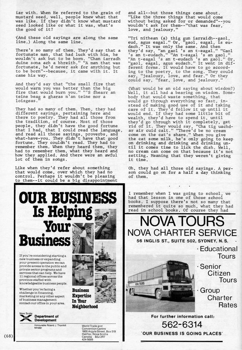 Published by Ronald Caplan on 1987/1/1 (261 reads)iar with. When He referred to the grain of mustard seed, well, people knew what that was like. If they didn't know what mustard seed looked like or what it was, what's the good of it? (And these old sayings are along the same line.) Along the same line. There's so many of them. They'd say that a fortunate.man, that had luck with him, he wouldn't ask but to be bom, "Chan iarradh duine sona ach a bhreith." "A man that was fortunate, he'd never ask for anything but to be bom"--because, it came with it. It came his way. And they'd say that "the small fire that would warm you was better than the big fire that would bum you." "'S fhearr an teine beag a gharas n'an teine mor a loisgeas." They had so many of them. Then, they had different sayings, pertaining here and there to poetry. They had all those from the tradition, of course. Most of those people, they didn't have the good fortune that I had, that I could read the language, and read all those sayings, proverbs, and what-have-you. They didn't have that good fortijne. They couldn't read. They had to remember them. When they heard them, they had to remember them, what they heard and how they applied. And there were an awful lot of them in songs. Like when they'd refer about something that would come, over which they had no control. Perhaps it wouldn't be pleasing to _them • it could be a_big disappointment (68) OUR BUSINESS Is Helping '' Business*" '' If you're considering starting a new business or expanding your present operation we can provide access to the public and private sector programs and services that can help. We have 11 regional offices across the province staffed with knowledgeable business people. Whether you're facing a challenge in financing, marketing or any other aspect of business management contact our office in your area. Expertise In Your Neighborhood Department of Development Honourable Roland J. Thornhill World Trade and Convention Centre 1800 Argyle Street. Box 519 Halifax. Nova Scotia Canada B3J 2R7 424-5689 and all--but those things came about. "Like the three things that would come without being asked for or demanded"--you wouldn't ask for them--"that was fear, love, and jealousy." "Tri nithean (a) thig gun iarraidh--gaol, eud, agus eagal." Or, "gaol, eagal, is eu- dach." It was only the same. And then they'd say, "an gaol 's an t-eagal." "Gaol 's an t-eudach • " "An t-eagal 's an gaol." "An t-eagal 's an t-eudach 's an gaol." Or, "gaol, eagal, agus eudach." It went in dif? ferent forms. It would have to go accord? ing to the poetry, to the song. They could say, "jealousy, love, and fear." Or they could say, "fear, love, and jealousy." (What would be an old saying about wisdom?) Well, it all had a bearing on wisdom. Some? body that would waste something, that would go through everything so fast, in? stead of making good use of it and taking care of it. They'd follow it up until it would end. If they had some little bit of wealth, they'd have to spend it, until they'd go through with it completely, get rid of it. They would say, "Cha tig uachd- ar air cuid cait." "There'd be no cream come on the cat's share." When you give the cat some milk, he's only going to keep on drinking and drinking and drinking un? til it comes time to lick the dish. Well, no cream can come on that because it's not setting. Meaning that they weren't giving it time. Oh, they had all those old sayings. A per? son could go on for a half a day thinking of them. I remember when I was going to school, we had that lesson in one of those school books. I suppose there's not so many that remembered it quite so much, what they had read in school books. Of course they had NOVA TOURS NOVA CHARTER SERVICE 56 INGLIS ST., SUITE 502, SYDNEY, N.S. ?? Educational Tours Senior Citizen Tours Group Charter Rates For further information call: 562-6314 OUR BUSINESS IS GOING PLACES'