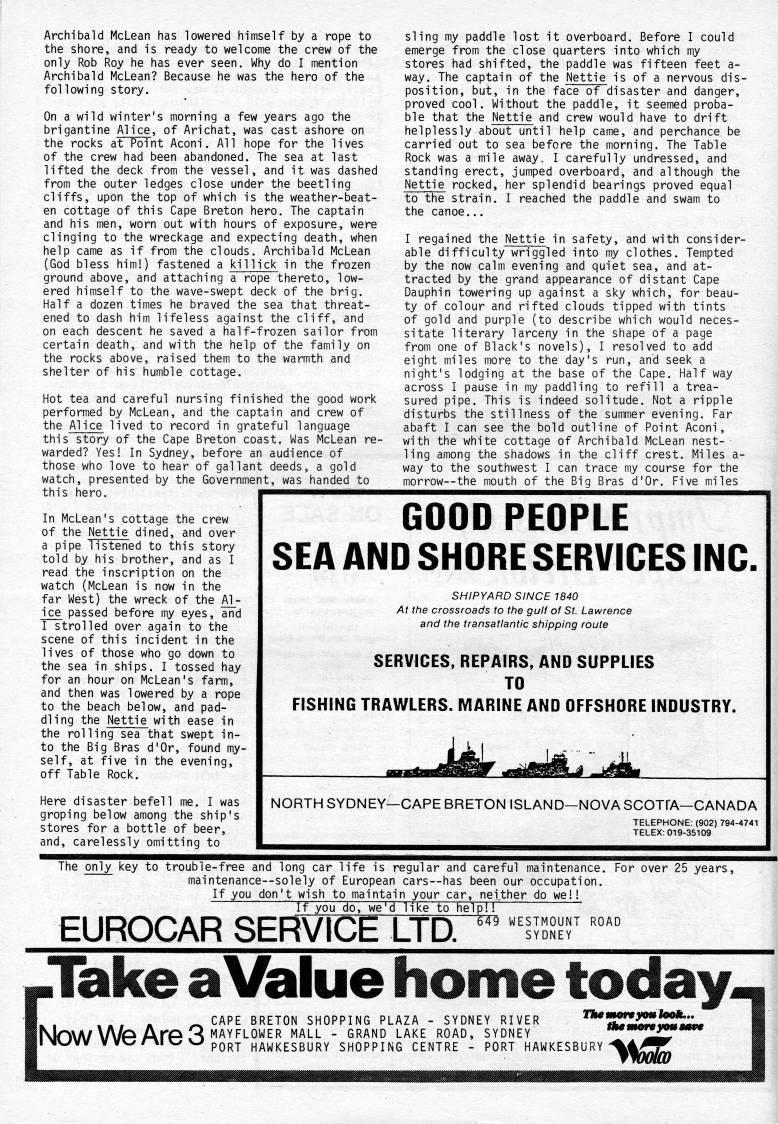 Published by Ronald Caplan on 1987/1/1 (208 reads)Archibald McLean has lowered himself by a rope to the shore, and is ready to welcome the crew of the only Rob Roy he has ever seen. Why do I mention Archibald McLean? Because he was the hero of the following story. On a wild winter's morning a few years ago the brigantine Alice, of Arichat, was cast ashore on the rocks at Point Aconi. All hope for the lives of the crew had been abandoned. The sea at last lifted the deck from the vessel, and it was dashed from the outer ledges close under the beetling cliffs, upon the top of which is the weather-beat? en cottage of this Cape Breton hero. The captain and his men, worn out with hours of exposure, were clinging to the wreckage and expecting death, when help came as if from the clouds. Archibald McLean (God bless him!) fastened a killick in the frozen ground above, and attaching a rope thereto, low? ered himself to the wave-swept deck of the brig. Half a dozen times he braved the sea that threat? ened to dash him lifeless against the cliff, and on each descent he saved a half-frozen sailor from certain death, and with the help of the family on the rocks above, raised them to the warmth and shelter of his humble cottage. Hot tea and careful nursing finished the good work performed by McLean, and the captain and crew of the Alice lived to record in grateful language this story of the Cape Breton coast. Was McLean re? warded? Yes! In Sydney, before an audience of those who love to hear of gallant deeds, a gold watch, presented by the Government, was handed to this hero. sling my paddle lost it overboard. Before I could emerge from the close quarters into which my stores had shifted, the paddle was fifteen feet a- way. The captain of the Nettie is of a nervous dis? position, but, in the face of disaster and danger, proved cool. Without the paddle, it seemed proba? ble that the Nettie and crew would have to drift helplessly about until help came, and perchance be carried out to sea before the morning. The Table Rock was a mile away.. I carefully undressed, and standing erect, jumped overboard, and although the Nettie rocked, her splendid bearings proved equal to the strain. I reached the paddle and swam to the canoe... I regained the Nettie in safety, and with consider? able difficulty wriggled into my clothes. Tempted by the now calm evening and quiet sea, and at? tracted by the grand appearance of distant Cape Dauphin towering up against a sky which, for beau? ty of colour and rifted clouds tipped with tints of gold and purple (to describe which would neces? sitate literary larceny in the shape of a page from one of Black's novels), I resolved to add eight miles more to the day's run, and seek a night's lodging at the base of the Cape. Half way across I pause in my paddling to refill a trea? sured pipe. This is indeed solitude. Not a ripple disturbs the stillness of the summer evening. Far abaft I can see the bold outline of Point Aconi, with the white cottage of Archibald McLean nest? ling among the shadows in the cliff crest. Miles a- way to the southwest I can trace my course for the morrow--the mouth of the Big Bras d'Or, Five miles In McLean's cottage the crew of the Nettie dined, and over a pipe listened to this story told by his brother, and as I read the inscription on the watch (McLean is now in the far West) the wreck of the Al? ice passed before my eyes, and I strolled over again to the scene of this incident in the lives of those who go down to the sea in ships. I tossed hay for an hour on McLean's farm, and then was lowered by a rope to the beach below, and pad? dling the Nettie with ease in the rolling sea that swept in? to the Big Bras d'Or, found my? self, at five in the evening, off Table Rock. Here disaster befell me. I was groping below among the ship's stores for a bottle of beer, and, carelessly omitting to GOOD PEOPLE SEA ANO SHORE SERVICES INC. SHIPYARD SINCE 1840 At the crossroads to the gulf of St. Lawrence and the transatlantic shipping route SERVICES, REPAIRS, AND SUPPLIES TO FISHING TRAWLERS. IVIARINE AND OFFSHORE INDUSTRY. NORTH SYDNEY • CAPE BRETON ISLAND • NOVA SCOTIA • CANADA TELEPHONE: (902) 794-4741 TELEX; 019-35109 mm The only key to trouble-free and long car life is regular and careful maintenance. For over 25 years, maintenance--solely of European cars--has been our occupation. If you don't wish to maintain your car, neither do we!! If you do, we'd like to help!! EUROCAR SERVICE LTD. '""""'" "" Take a Value home today ' CAPE BRETON SHOPPING PLAZA - SYDNEY RIVER """ '"" Now W?? ArGo '''''?''' ''''-'- " '''''' '-'''' ''?'?* SYDNEY The tmortyouJooHL., PORT HAWKESBURY SHOPPING CENTRE - PORT HAWKESBURY '%MfkO 1