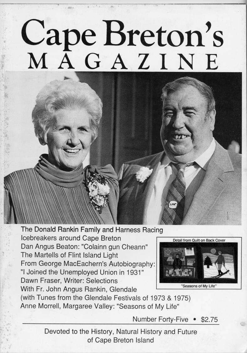 • The Donald Rankin Family and Harness Racing • Icebreakers around Cape Breton • Dan Angus Beaton: "Colainn gun Cheann" • The Martells of Flint Island Light • From George MacEachern's Autobiography • Dawn Fraser, Writer: Selections • With Fr. John Angus Rankin, Glendale • Anne Morrell, Margaree Valley "Seasons of My Life"