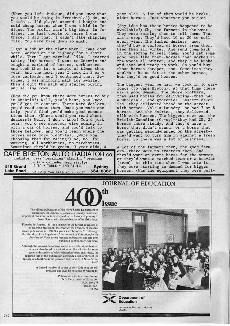 (When you left Judique, did you know what you would be doing in Frenchvale?) No, no, I didn't. I'd played around--I bought and sold cheap horses when I was a kid in Ju? dique. The profit wasn't big then. In Ju? dique, the last couple of years I was there, I did that. I didn't like shipping milk. You were tied down so much. I got a job at the plant when I came down here. Worked on the highway for a short while. Then I got married. 1944. I started taking (in) horses. I went to Ontario and bought a carload of horses, workhorses. And took them in. A couple of times that year. And the next year I took in 3 or 4 more carloads. And I continued that. Be? sides, I was shipping milk for awhile, then I quit the milk and started buying and selling cows. (How did you know there were horses to buy in Ontario?) Well, you'd hear, you know, you'd get in contact. There were dealers, you'd read about them. Once you made one trip, you'd find you'd make good connec? tions then. (Where would you read about dealers?) Well, I don't know! You'd just hear, you'd see somebody else coming in with a car of horses, and you'd talk to those fellows, and you'd learn where the horses were more plentiful. (Were you choosing them for racing?) No, no, for working, all workhorses, no racehorses. Sometimes they'd be green, 3-year-olds, 4- year-olds. A lot of them would be broke, older horses. Just whatever 'ou picked. (Any idea how these horses happened to be available?) Oh, the farmers in the west. They were raising them to sell them. That was a crop. They'd have 10 or 20 to sell every year. The lumber dealers, now, they'd buy a carload of horses from them. Used them all winter. And send them back in the spring to sell them. You'd get some good buys like that--horses that worked in the woods all winter, and they'd be broke and shod and ready to work. So you'd buy those horses cheaper, too. Sometimes they wouldn't be as fat as the other horses, but they'd be good horses. The biggest year we had, we took in 10 car? loads (to Cape Breton). At that time there was a good demand. The Shore brothers, they used horses for delivering--they had a wholesale, and groceries. Eastern Baker? ies, they delivered bread on the street with horses. Vale's Laundry, he had 7 or 8 horses. And the dairies, they delivered milk with horses. The biggest user was the British-Canadian (Co-op)--they had 20, 25 horses there steady. And they'd have a horse that didn't stand, or a horse that was getting second-handed on the street-- they'd want to turn him in against a fresh horse. So there was a lot of business. CAPE BRETON AUTO RADIATOR co. radiator hoses ' repairing * cleaning * recoring complete cylinder head service 518 Grand AUTO * TRUCK * INDUSTRIAL Sydney Lake Road >'we Help You Keep Your Cool" 564-6362 (2) /i/?n The official publication of the Nova Scotia Department of Education, the Journal of Education recently marked an important milestone in its career, and in the history of printmg m Nova Scotia, with the publication of its 400th issue. Founded in August, 1851 as a vehicle for the further education of the teaching profession, the Journal, for a variety of reasons, ceased publication in 1860. Six years later, however, ". . . through the liberality of the Legislature," the Journal of Education for the Province of Nova Scotia resumed publication and has been published continuously ever smce. Although the Journal has always served as an official publication, it never abandoned its aspiration to offer a forum for more general discussion of wider education issues and, today, the collected files of this publication constitute a rich archive of the history of education in the province and, indeed, of Nova Scotia itself A limited number of copies of the 400th issue are still available and may be obtained by wntmg to: Publication and Reference Section N.S. Department of Education P.O. Box 578 Halifax. N.S. B3.I 2S9 ers--there were no tractors then. And they'd want an extra horse for the summer, or they'd want a matched team or a heavier (team). At this time when I was into it, they were starting to demand for bigger horses. (Was the equipment they were pull- JOURNAL OF EDUCATION -th Issue ' PWip ?? '?? 'Jm' '''h* ??t'9K|k'' Nova Scotia 'm' Department of ''' Education Honourable Thomas J. Mclnnis Minister ''KM''V''n??'''''T t ' % iini '-'B