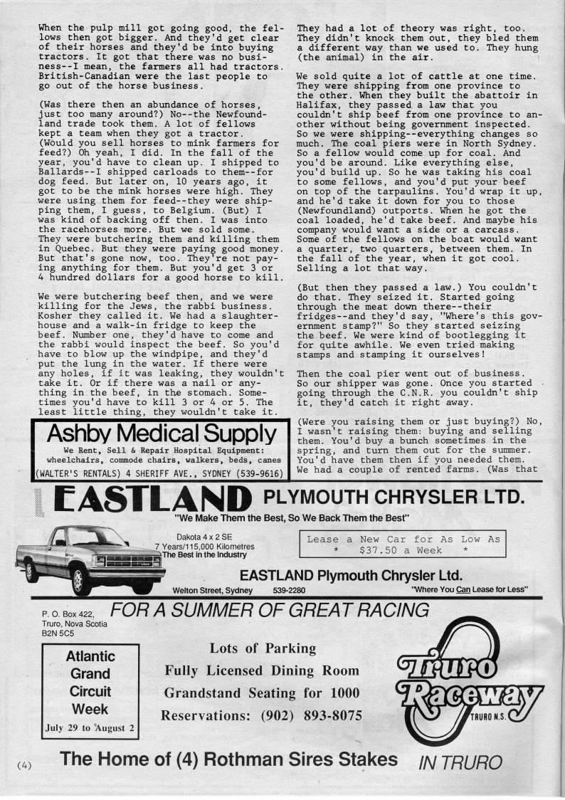 When the pulp mill got going good, the fel? lows then got bigger. And they'd get clear of their horses and they'd be into buying tractors. It got that there was no busi? ness--! mean, the farmers all had tractors. British-Canadian were the last people to go out of the horse business. (Was there then an abundance of horses, just too many around?) No--the Newfound? land trade took them. A lot of fellows kept a team when they got a tractor. (Would you sell horses to mink farmers for feed?) Oh yeah, I did. In the fall of the year, you'd have to clean up. I shipped to Ballards--I shipped carloads to them--for dog feed. But later on, 10 years ago, it got to be the mink horses were high. They were using them for feed--they were ship? ping them, I guess, to Belgium. (But) I was kind of backing off then. I was into the racehorses more. But we sold some. They were butchering them and killing them in Quebec. But they were paying good money. But that's gone now, too. They're not pay? ing anything for them. But you'd get 3 or 4 hundred dollars for a good horse to kill. We were butchering beef then, and we were killing for the Jews, the rabbi business. Kosher they called it. We had a slaughter? house and a walk-in fridge to keep the beef. Number one, they'd have to come and the rabbi would inspect the beef. So you'd have to blow up the windpipe, and they'd put the lung in the water. If there were any holes, if it was leaking, they wouldn't take it. Or if there was a nail or any? thing in the beef, in the stomach. Some? times you'd have to kill 3 or 4 or 5. The least little thing, they wouldn't take it. Ashby Medical Supply We Rent, Sell & Repair Hospital Equipment: wheelchairs, commode chairs, walkers, beds, canes (WALTER'S RENTALS) 4 SHERIFF AVE., SYDNEY (539-9616) They had a lot of theory was right, too. They didn't knock them out, they bled them a different way than we used to. They hung (the animal) in the air. We sold quite a lot of cattle at one time. They were shipping from one province to the other. When they built the abattoir in Halifax, they passed a law that you couldn't ship beef from one province to an? other without being government inspected. So we were shipping--everything changes so much. The coal piers were in North Sydney. So a fellow would come up for coal. And you'd be around. Like everything else, you'd build up. So he was taking his coal to some fellows, and you'd put your beef on top of the tarpaulins. You'd wrap it up, and he'd take it down for you to those (Newfoundland) outports. When he got the coal loaded, he'd take beef. And maybe his company would want a side or a carcass. Some of the fellows on the boat would want a quarter, two quarters, between them. In the fall of the year, when it got cool. Selling a lot that way. (But then they passed a law.) You couldn't do that. They seized it. Started going through the meat down there--their fridges--and they'd say, "Where's this gov? ernment stamp?" So they started seizing the beef. We were kind of bootlegging it for quite awhile. We even tried making stamps and stamping it ourselves! Then the coal pier went out of business. So our shipper was gone. Once you started going through the C.N.R. you couldn't ship it, they'd catch it right away. (Were you raising them or just buying?) No, I wasn't raising them: buying and selling them. You'd buy a bunch sometimes in the spring, and turn them out for the summer. You'd have them then if you needed them. We had a couple of rented farms. (Was that EASTLAND Plymouth chrysler ltd. "We Make Them the Best, So We Back Them the Best" Dakota 4 x 2 SE 7 Years/115,000 Kilometres 'The Best in the industry Lease a New Car for As Low As * $37.50 a Week * EASTLAND Plymouth Chrysler Ltd. Weiton Street, Sydney 539-2280 "Where You Can Lease for Less" P. O. Box 422, Truro, Nova Scotia B2N 505 FOR A SUMMER OF GREAT RACING Atlantic Grand Circuit Week July 29 to August 2 Lots of Parking Fully Licensed Dining Room Grandstand Seating for 1000 Reservations: (902) 893-8075 (4) The Home of (4) Rothman Sires Stakes in tRURO