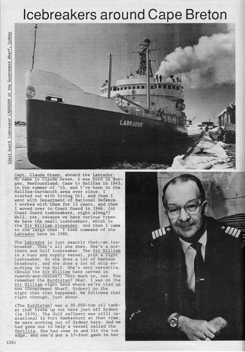 Icebreakers around Cape Breton Capt. Claude Green, aboard the Labrador: My name is Claude Green. I was born in Bur- geo, Newfoundland. Came to Halifax in 1945, in the summer of '45, and I've been in the Halifax-Dartmouth area ever since. I started out with Irving Oil, and then I went with Department of National Defence. I worked with them for 13 years, and then I moved over to Coast Guard in 1966. (At Coast Guard icebreakers, right along?) Well, yes, because we have various types. We have the small icebreakers, which is the Sir William Alexander. And then I came to the large ones. I took command of the Labrador here in 1980. .The Labrador is just exactly that--an ice? breaker. That's all she does. She's a nor? thern and Gulf icebreaker. The Sir William is a buoy and supply vessel, plus a light icebreaker. So she does a lot of harbour breakouts, and she does a lot of ship es? corting in the Gulf. She's very versatile. (Would the Sir William have served in search-and-rescue?) Very much so, yes. You remember the Kurdistan? Okay. I was on the Sir William right here where we're tied up now (Government Wharf, Sydney) on the night that that happened. We followed that right through, just about. (The Kurdistan) was a 30,000-ton oil tank? er that broke up out here just off Sydney (in 1979). The Gulf refinery was still op? erational in Port Hawkesbury at that time. We were working out of Sydney here. And we had gone out to help a vessel called the Merillia. She had come in and hit the ice edge, and she'd put a 17-foot gash in her (26)