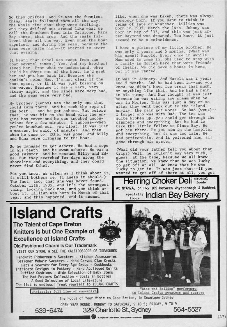 Published by Ronald Caplan on 1987/6/1 (371 reads)So they drifted. And it was the funniest thing: seals followed them all the way, the whole time that they were drifting. And they drifted out around like what we call the Southern Head into Catalone, Mira Bay there' that area. And the seals fol? lowed them all the way. Even when the boat capsized, and during the seas, because the seas were quite high--it started to storm that evening. (I heard that Ethel was swept from the boat several times.) Yes. And (my brother) saved her. From what we understand, when she'd be swept out of the boat, he'd grab her and put her back in. Because she couldn't swim. Now, I'm not clear if the boat upset, or if it was just tossing on the waves. Because it was a very, very stormy night, and the winds were very bad, and the seas were very bad. My brother (Kenny) was the only one that could swim there. And he took the rope of the boat... and he got ashore. But before that, he was hit on the head with the en? gine box cover and he was knocked uncon? scious for a few minutes. I suppose--when you're knocked out, you float. It was just a matter, he said, of minutes. And then when he came to, Ethel was gone. And Billy and Edna were clinging to the boat. So he managed to get ashore. He had a rope in his teeth, and he swam ashore. He was a good swimmer. And he rescued Billy and Ed? na. But they searched for days along the shoreline and everything, and they could never find Ethel. But you know, as often as I think about it, it still bothers me. (I guess it should.) The fact, too, that she was never found. October 15th. 1935. And it's the strangest thing, looking back now, and you think a- bout it. Lillian was born in March of that year, and this happened. And it seemed like, when one was taken, there was always somebody born. If you want to think in terms of fate or whatever. Lillian was born in 1935. March the 14th. Johnny was born in May of '33, and this was just af? ter Raymond was drowned. You know, it just seemed to be a coincidence. I have a picture of my little brother. He was only 2 years and 5 months. (What was his name?) Harold. Every once in awhile Mum used to come in. She used to stay with a family in Morien here that were friends of theirs. We did have a house in here, but it was rented. It was in January. And Harold was 2 years and 5 months. And he had been in--and you know, we didn't have ice cream that much, or anything like that. And he had a pain in his tummy. And Mum thought it was just because he was eating ice cream when he was in Morien. This was just a day or so after they went back out to the island. An3rway, the pain got worse. So Dad (went)-- I forget who was with Dad. The ice was quite broken up--you could get through the clampers and everything. But he had to take the little fellow to Glace Bay. He got him there. He got him in the hospital and everything, but it was too late. He had peritonitis. And it poisoned him, all gone through his system. (What did your father tell you about that trip?) Well, he couldn't say very much, I guess, at the time, because we all knew the situation. We knew that he was lucky to get off at all. We knew that he was lucky to get in. It was just that--if you wanted to get off of there at all, you got Herring Choker Deli • At NYANZA, on Hwy 105 between Whycocomagh & Baddeck natural foods "'Tolll'' Indian Bay Bakery Island Crafts The Talent of Cape Breton Knitters Is but One Example of Excellence at Island Crafts Old-Fashioned Charm Is Our Trademark VISIT OUR STORE & SEE THE KALEIDOSCOPE OF TREASURES Handknit Fishermen's Sweaters - Kitchen Accessories Designer Mohair Sweaters - Hand Carved Clan Crests Hats & Scarves-for Every Age Group - Cookbooks Intricate Designs in Pottery - Hand Appliqued Quilts Ruffled Cushions - Wide Selection of Baby Items The Mad Potters Collection - Boats in Bottles A Good Selection of Local Literature The list is endless! Treat yourself to ISLAND CRAFTS. "Rise and Follies" performers in Island Crafts sweaters and scarves Iwholesale; full line of souvenirsi The Focus of Your Visit to Cape Breton, in Downtown Sydney OPEN YEAR ROUND: MONDAY TO SATURDAY, 9 TO 5; FRIDAY, 9 TO 9 539-6474 329 Charlotte St., Sydney HHII'HHillHilliii''HHllHHIHI ?p aproiwtofciHMB 564-5527 (47):