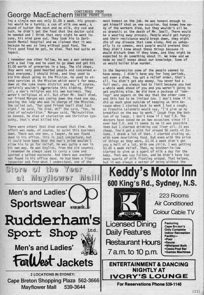 Published by Ronald Caplan on 1987/6/1 (175 reads)CONTINUED FROM George MacEachern iNSTPE-TRONr'ovER ing a single man was only $1.00 a week. His grocer? ies would be a turnip, a can of milk one week, k pound of butter the next and no milk, dry cod and such. He didn't get the food that the doctor said he needed and I think that very night he went inr- sane, his mind gave out. They took him to Dart? mouth Mental Hospital and we claimed that it was because he was so long without good food. The first good food he got, he died. That had quite an impact. I remember one other fellow, he was a war veteran with a bad limp and he used to go down and get his $1.00 worth of groceries in a bag. The old chaps, they were very good hearted people and concerned a- bout everyone, I should think, and they used to kid him about going to the Mission. He used to at? tend services at the Mission which wasn't far away, down at the coke ovens district and he, of course, certainly wouldn't appreciate this kidding. After all, a man's religion was his own business. They weren't religious at all. But after Mr. Small died, our friend Morgan was coming down the road one day, passing the lady who was in charge of the Mission. She called out, "Our good friend Small died last night." He said, "He died, eh?" She said, "Yes, he died of malnutrition." Morgan said, "Malnutrition be damned, he died of starvation and Christian sym? pathy, that's what killed him." There were others that died around that time. An effort was made, of course, to quiet this business down. There was one man, a lawyer, he was found dead in his office. This is just conjecture, but it could have been that the man's pride wouldn't allow him to go for relief. He was quite a man in his own way. He was English, from the old country. I remember he always used to carry a cane and sported a spiked mustache. And there was another man found in his office dead. He had been a liquor inspector and from what I understand, one of the most honest on the job. He was honest enough to get himself shot on one occasion. God knows how ma? ny of the workers died, but they wouldn't all be as dramatic as the death of Mr. Small. There would be a wearing away process. People would get hungry and their resistance would break down, they might die of any disease that came along. And as unhap? pily is so common, most people would pretend that they didn't know about these things because it would disturb them if they knew, and they might be expected to do something about it. We knew and we made no small bones about our knowledge. Some of us would holler blue murder. In the Depression some of the people seemed to have money. I didn't have any for long periods, not even a dime. You got a relief order, that's all. You didn't get any money. You never had a full meal, you always had to limit because you had a whole week ahead of you and you weren't going to get anything else. We did have a package of "mak? ings" and papers on the day that the order came and this had to be limited too. I don't know if it did us much good outside of keeping us thin be? cause when I started back to work I had a cough; as Frenchie Lelandais would say, "I'd give up my breakfast on the way to work." Cough from the bot? tom of my lungs. I don't know if I had T.B. The doctors have asked me on two occasions since if I ever had T.B. and it seems to me it was possible then but I started drinking cod liver oil. It was cheap. You'd get a pint for around 50 cents at Ba? tons. I drank a lot of that. I started picking up, with some nourishing food. But even with the price of things as they were, $3.00 a week didn't get you a hell of a lot. With one child, I was getting $3.00 a week relief. Then, my brother-in-law started to give us a quart of milk a day for the baby. That was Lou Fulton, and he didn't have too many quarts of milk floating around. That helped, but it was always a matter of doing without the )l@Dr(i ??If Utrl?? • • 1? Men's and Ladies' ( jT' Sportswear )'' Rudderham's Ltd. Sport Shop Men's and Ladies' fmUi' Jackets 2 LOCATIONS IN SYDNEY: Cape Breton Shopping Plaza 562-3666 Mayflower Mall 539-3644 Keddy's Motor Inn 600 King's Rd., Sydney, N.S. 223 Rooms Air Conditioned Colour Cable TV Licensed Dining Daily Features Resitaurant Hours 7a.ra to 10 p.m. Featuring Cape Broton's Only Complete Indoor Recreation Facility • • Pool • Sauna • Whirlpool Bath • Oasis Pool Bar • Games Machines ENTERTAINMENT & DANCING NIGHTLY AT IVORY'S LOUNGE For Reservations Phone 539-1140 (53)