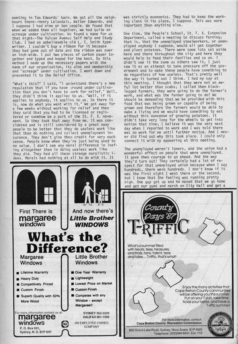 Published by Ronald Caplan on 1987/6/1 (142 reads)meeting in Tom Edwards' barn. We got all the neigh? bours there--Henry Lelandais, Walter Edwards, and I suppose I had nine or ten people. We found that when we added them all together, we had quite an acreage under cultivation. We found a name for us that night--The Vulcan Avenue Self Help and Study Club. I had an unbelievable old L. C. Smith type? writer. I couldn't buy a ribbon for it because they had gone out of date and the ribbon was over an inch wide. I put two pieces of carbon paper to? gether and typed and hoped for the best. By this method I made up the necessary papers with .the name of our organization, its aims and membership and "acreage" under cultivation. I went down and presented it to the Relief Office. "What's this?" I said, "I understand there's a new regulation that if you have ground under cultiva? tion that you don't have to work for relief." Well, they didn't think it applied to us. "Well, if it applies to anybody, it applies to us. So there it is, now do what you want with it." We got away for a few weeks without working for relief and then they said that you had to be licensed or regis? tered or somehow be a part of the St. F. X. move? ment. So they took that away from me. It was con? sidered and is still considered by a great many people to be better that they do useless work like that than do nothing and collect unemployment in? surance. They don't give them credit for very much sense. People know when they're just being used to no value. I don't see any moral difference in loaf? ing altogether than in doing useless work like they did. They had all these strange moralistic i- deas. Morals had nothing at all to do with it. It First There is margaree windows And now there's LiWe Brother WINDOWS What's the Difference? Margaree Windows I Lifetime Warranty I Heavy Duty I Competitively Priced I Custom Finish I Superb Quality with 50% More Wood For more information contact us at: margaree windows @ P.O. Box691, ';' Sydney, N. S. Bl P 6H7 f Little Brother Windows I One Year Warranty I Lightweight I Lowest Price on Market I Custom Finish I Competes with any Window - except Margaree!! SYDNEY 562-3220 HALIFAX 861-1500 AN EMPLOYEE-OWNED COMPANY was Strictly economics. They had to keep the work? ing class in its place, I suppose. This was more important than anything else. One time, the People's School, St. F. X. Extension Department, called a meeting to discuss farming; that is, that the unemployed steelworkers, or unem? ployed anybody I suppose, would all get together and plant potatoes. There were some lots set aside here and there throughout the city and here they would help to feed their families and so on. I didn't see it the same as others saw it, I just saw it as an attempt to take pressure off the gov? ernment and to make these people have something to do regardless of how useless. That's pretty well the way it turned out I think. I had my say at this meeting. I thought that they were not an aw? ful lot better than scabs; I called them black- legged farmers, they were going to do the farmer's work, and what was the farmer going to do? We should be demanding that we be provided with this food that was being grown or capable of being grown and therefore the farmers would be able to make a living and we would have something to eat without this nonsense of growing potatoes. It didn't take very long for the wheels to get into motion that time; I believe it was the very next day when I reported to work and I was told there was no work for me until further notice. And I nev? er did find out why this took place. I could only connect it with my appearing at this meeting. The unemployed weren't loners, and the union had a wonderful effect on people that were unemployed. It gave them courage to go ahead. And the way they'd turn out! They certainly had a lot of re? spect for that unemployed union because when I say hundreds, there were hundreds. I don't know if it was the first night I went there or the second, but I know that the feeling was running pretty high. One guy got up and he moved that we go home and get our guns and march on City Hall and get a r'lFFlC What's a summer filled v/ith treats, tees, treasures, and trails, tans. talent, teas and tales.... T-riff ic, that's v/hat! Enjoy the many activities that Cape Breton County communities will be offering you this summer. Put on your T-shirt, take time, tickle your tastes, ond hove a T-riff ic summer! for more information, contact: 865 Grartd Lake!