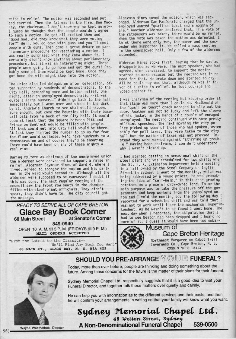 Published by Ronald Caplan on 1987/6/1 (146 reads)raise in relief. The motion was seconded and put and carried. Then the fat was in the fire. Dan Mac- Kay, the chairman--I don't know why he kept quiet-- I guess he thought that the people wouldn't agree to such a motion. He got all excited then and "Good God, did they know what they were voting for?" Well, you go down with guns and you'll meet people with guns. Then came a great debate on par? liamentary procedure for rescinding a motion. I was really surprised what they knew about it. I certainly didn't know anything about parliamentary procedure, but it was an interesting night. These people were going to go home and get the guns! Pro? bably some of them would be kept home. Once they got home the wife might step into the action. The union also led delegation after delegation, of? ten supported by hundreds of demonstrators, to the City Hall, demanding more and better relief. One night, after an unemployed demonstration--it was quite a large number--! didn't go back to the hall immediately but I went over and stood in the dark by St. Andrew's Church to see what would happen. Sure enough, out come the Mounties with their base? ball bats from in back of the City Hall. It would seem at least that the square between Pitt and Prince on Bentinck would be filled with people. All that could get into City Hall would be there. At last they limited the number to go up for fear the floor would collapse. We'd have hundreds to a demonstration and of course they'd be shouting. There could have been on any of these nights a real riot. During my term as chairman of the unemployed union the aldermen were canvassed to support a raise in relief. Alderman Seymour Hines of Ward 4, where I lived, agreed to spon??or the mo.tion and his part? ner in the ward would second it. Although all the aldermen were supposed to be canvassed I doubt if this was done. The next regular meeting of the council saw the front row seats in the chamber filled with steel plant officials. They didn't speak, they didn't have to. The city council got the message. READY TO SERVE ALL OF CAPE BRETON Glace Bay Book Corner 68 Main Street at Senator's Corner 849-0940 OPEN 10 A. M. till 5 P. M. (FRIDAYS till 9 P. M.) MAIL ORDERS ACCEPTED "From the Latest to the Classics • We'll Find Any Book You Want' 68 MAIN ST., GLACE BAY, N. S. BlA 4X9 Alderman Hines moved the motion, which was sec? onded. Alderman Dan MacDonald charged that the un? employed wanted "quail on toast and a noggin of ale," Another alderman declared that, if a vote of the ratepayers was taken, there would be no relief. When the vote was taken the motion was defeated. I think there were only two, the mover and the sec? onder who supported it. We called a mass meeting in the unemployed hall. Only a few of the aldermen attended. Alderman Hines spoke first, saying that he was as disappointed as we were. The next speaker, who had agreed, when canvassed, to support the motion started to make excuses but the meeting was in no mood for that. He broke down and started to cry. All he could say was that, although he was in fa? vor of a raise in relief, he lost courage and voted against it, I was chairman of the meeting but keeping order at that stage was more than I could do, MacDonald of the "quail on toast" crack managed to slip out the door. Another was not so lucky and left the sleeve of his jacket in the hands of a couple of enraged unemployed. The meeting continued with some pretty militant speeches. The next morning the city po? lice picked up some of those who had spoken, osten? sibly for poll taxes. They were taken to the city hall but the matter of taxes was not pressed. In? stead they were warned against "stirring up troub? le." Having been chairman, I couldn't understand why I wasn't picked up. I had started getting an occasional shift on the steel plant and was schedulted for two shifts when the St, F, X. Extension Department held a meeting in a hall owned by the Steel Company on Inglis Street in Sydney, I went to the meeting, which was being addressed by a young priest. He was promot? ing the idea of "self-help," in this case growing potatoes on a piece of city-owned land. To me the main purpose was to take the pressure off the gov? ernments and keep workers from the unemployed un? ion and I told the meeting so. The following day I reported for a scheduled shift and was told that I was not to work until I saw the mechanical superin? tendent. As he wasn't to be found I went home. The next day when I reported, the stipulation that I had to see Beaton had been dropped and I heard no more of it. I guess it would have been too embar- Museum of Cape Breton Heritage Northeast Margaree on Cabot Trail Inverness Co., Cape Breton, N. S. OPEN 9 TO 6 DAILY 56)- Wayne Weatherbee, Director SHOULD YOU PRE-ARRANGE ?? @ P 1 FUNERAL? Today, more than ever before, people are thinking and doing something about the future. Among those concerns for the future is the matter of their plans for their funeral. Sydney Memorial Chapel Ltd. respectfully suggests that it is a good idea to visit your Funeral Director, and together talk these matters over quietly and calmly. He can help you with information as to the different services and their costs, and then he will confirm your arrangements in writing so that your family will know what you want. Si'cCnei' !Memoricit Chapel Ltd. 49 Weiton Street, SifcCnetp A Non-Denominational Funeral Chapel 539-0500