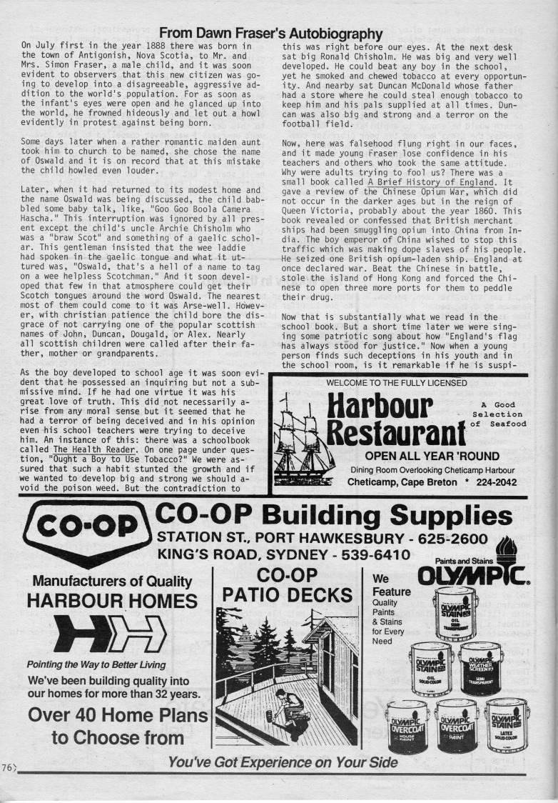 Published by Ronald Caplan on 1987/6/1 (170 reads)On July first in the year 1888 there was born in the town of Antigonish, Nova Scotia, to Mr. and Mrs. Simon Fraser, a male child, and it was soon evident to observers that this new citizen was go? ing to develop into a disagreeable, aggressive ad? dition to the world's population. For as soon as the infant's eyes were open and he glanced up into the world, he frowned hideously and let out a howl evidently in protest against being born. Some days later when a rather romantic maiden aunt took him to church to be named, she chose the name of Oswald and it is on record that at this mistake the child howled even louder. Later, when it had returned to its modest home and the name Oswald was being discussed, the child bab? bled some baby talk, like, "Goo Goo Boola Camera Hascha." This interruption was ignored by all pres? ent except the child's uncle Archie Chisholm who was a "braw Scot" and something of a gaelic schol? ar. This gentleman insisted that the wee laddie had spoken in the gaelic tongue and what it ut- tured was, "Oswald, that's a hell of a name to tag on a wee helpless Scotchman." And it soon devel? oped that few in that atmosphere could get their Scotch tongues around the word Oswald. The nearest most of them could come to it was Arse-well. Howev? er, with christian patience the child bore the dis? grace of not carrying one of the popular Scottish names of John, Duncan, Dougald, or Alex. Nearly all Scottish children were called after their fa? ther, mother or grandparents. As the boy developed to school age it was soon evi? dent that he possessed an inquiring but not a sub? missive mind. If he had one virtue it was his great love of truth. This did not necessarily a- rise from any moral sense but it seemed that he had a terror of being deceived and in his opinion even his school teachers were trying to deceive him. An instance of this: there was a schoolbook called The Health Reader. On one page under ques? tion, "Ought a Boy to Use Tobacco?" We were as? sured that such a habit stunted the growth and if we wanted to develop big and strong we should a- void the poison weed. But the contradiction to From Dawn Fraser's Autobiography this was right before our eyes. At the next desk sat big Ronald Chisholm. He was big and wery well developed. He could beat any boy in the sclrool, yet he smoked and chewed tobacco at ewery opportun? ity. And nearby sat Duncan McDonald whose father had a store where he could steal enough tobacco to keep him and his pals supplied at all times. Dun? can was also big and strong and a terror on the football field. Now, here was falsehood flung right in our faces, and it made young Fraser lose confidence in his teachers and others who took the same attitude. Why were adults trying to fool us? There was a small book called A Brief History of England. It gave a review of the Chinese Opium War, which did not occur in the darker ages but in the reign of Queen Victoria, probably about the year 1860. This book revealed or confessed that British merchant ships had been smuggling opium into China from In? dia. The boy emperor of China wished to stop this traffic which was making dope slaves of his people. He seized one British opium-laden ship. England at once declared war. Beat the Chinese in battle, stole the island of Hong Kong and forced the Chi? nese to open three more ports for them to peddle their drug. Now that is substantially what we read in the school book. But a short time later we were sing? ing some patriotic song about how "England's flag has always stood for justice." Now when a young person finds such deceptions in his youth and in the school room, is it remarkable if he is suspi- WELCOME TO THE FULLY LICENSED Harbour Restaurant A Good Selection of Seafood OPEN ALL YEAR 'ROUND Dining Room Overlooking Cheticamp Harbour Cheticamp, Cape Breton * 224-2042 '''ZqX CO-OP Building Supplies Manufacturers of Quality HARBOUR HOMES STATION ST.. PORT HAWKESBURY - 625-2600 KING'S ROAD, SYDNEY - 539-6410 COOP PATIO DECKS MIH) Pointing the Way to Better Living We've been building quality into our homes for more than 32 years. Over 40 Home Plans to Choose from Paints and Stains I we OlMfll Feature Quality Paints & Stains for Every Need 76)_ You've Got Experience on Your Side