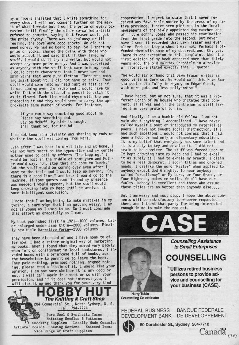 Published by Ronald Caplan on 1987/6/1 (167 reads)my officers insisted that I write something for every show. I will not comment further on the mer? it of what I wrote but I won the prize on ewery oc? casion. Until finally the other so-called artists refused to compete, saying that Fraser would get the prize anyway. There was no jealousy or ill feeling, the boys were good sports. We did not need money. We had no board to pay. So I spent my prize on Vodka, shared the drink with those who would accept it and said that if they liked my stuff, I would still try and write, but would not accept any more prize money. And I was surprised as anybody with the stuff that came into my head. I could create characters that I never saw and spin yarns that were pure fiction. There was noth? ing smart about it. I did not have to think. That stuff would come into my head just as fast as if it was coming over the radio and I would have to write fast with the stub of a pencil to catch it as it flowed. Each line would rhyme with the one preceding it and they would seem to carry the ap? proximate same number of words. For instance, If you can't say something good about me Please say something bad. Lay on McDuff. My hide is tough. I'll thank you for the Ad. I do not know if a divinity was shaping my ends or whether the stuff was coming from Mars. Even after I was back in civil life and at home, I was not very smart on the typewriter and my gentle mother used to call my efforts "Tap-tapping." I would be lost in the middle of some yarn and Moth? er would say, "Oh, stop that and come to lunch." But the stuff would be coming over even after I went to the table and I would leap up saying, "Oh, there is a good line," and back I would go to the machine. If some guests came in and my presence was needed I would appear, but the stuff would keep crowding into my head until it arrived at some intelligent conclusion. I note that I am beginning to make mistakes in my typing, a sure sign that I am getting weary. I am not as young as I used to be. So I must conclude this effort as gracefully as I can. My book published first in 1921 • 1000 volumes. Lat? er enlarged under same title • 2000 volumes. Final? ly new title Narrative Verse • 2500 volumes. They have been disposed of and I have none to of? fer now. I had a rather original way of marketing my books. When I found that they moved very slowly when left on consignment in local bookstores, I in? vaded homes with a briefcase full of books, ask the householder to permit me to leave the book. They paid nothing, pr6mised nothing, signed noth? ing, please read a little of it. I would like your opinion. I am not sure whether it is any good or not. I will call again in a week or so with your permission, and if it does not interest you, I will pick it up and thank you for your very kind cooperation. I regret to state that I never re? ceived any favourable notice by the press of my na? tive province. I have seen pictures in the local newspapers of the newly appointed dog catcher and of little Johnny Jones who passed his examination from the first grade into the second. But never have I seen it recorded that Dawn Fraser was even alive. Perhaps they wished I was not. Perhaps I of? fended them with some of my observations. Oh; yes. There is one exception to this complaint. When the first edition of my book appeared more than thirty years ago, the old Halifax Chronicle in a review of literature stated exactly this, I quote: "We would say offhand that Dawn Fraser writes as good verse as Service. We would call this Nova Sco? tia poet a Jim Tully in rhyme, an Edgar Guest, with more guts and less pollyannism." I have heard, but am not sure, that it was a Pro? fessor Logan of Dalhousie who dictated that com? ment. If it was and if the gentleman is still liv? ing I am very grateful to him. And finally • I am a humble old fellow. I am not vain about anything I accomplished. I have never called myself a poet or introduced my material as poems. I have not sought social distinction. If I had such ambitions I would not confess that I had been a hobo or had only an elementary education. It is my belief that everybody has some talent and it is a duty to try and develop it. I did not train to be a writer. The stuff was forced upon me. It kept crowding into my head and I had to expel it as surely as I had to exhale my breath. I claim to be a real democrat. I scorn titles and crowned heads. I dislike the word "Master" when applied to anybody except God Almighty. To hear anybody called "excellency" or My Lord, or Your Grace, or Your Highness, makes me smile. We all have our faults. Nobody is excellent and those who assume those titles are no better than anybody else But I am weary and must stop. I hope the above com? ments will be satisfactory to whoever requested them, and I thank that party for being interested enough in me to make the request. CASE HOBBY HUT The Knitting & Craft Shop 204 Commercial St., North Sydney, N. S, Tel. 794-7774 Pure Wool & Synthetic Yarns Knitting Needles & Patterns Smocking Supplies Locally Made Ceramics Artists' Boards Sewing Notions Knitted Items Wide Range of Craft Supplies Counselling Assistance to Small Enterprises COUNSELLING * Utilizes retired business persons to provide ad? vice and counselling for your business (CASE). Harry Tobin Counselling Co-ordinator FEDERAL BUSINESS DEVELOPMENT BANK BANQUE FEDERALE DE DEVELOPPEMENT ' 50 Dorchester St., Sydney 564-7710 Canada (79)