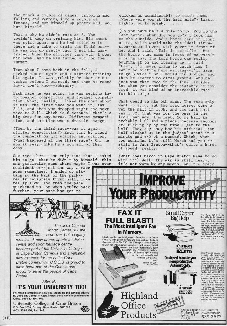 Published by Ronald Caplan on 1987/6/1 (208 reads)the track a couple of times, tripping and falling and running into a couple of fences, and cut himself up pretty bad, and hurt himself. That's why he didn't race as 3, You couldn't keep on training him. His chest was split open, and he had stitches in there and a tube to drain the fluid out-- he was cut up pretty bad, I got him cas? trated. When the stitches came out, I sent him home, and he was turned out for the summer. Then when I came back in the fall, I picked him up again and I started training him again. It was probably October or No? vember before I started, and then he raced in--I don't know--February. Each race he was going, he' was getting in? to tougher competition and tougher competi? tion. What, really, I liked the most about it was: the first race you went in, say 2.17, and then you dropped right the next race to 2.11, Which is 6 seconds--that's a big drop for any horse. Different competi? tion, and the time was a drastic change, (Then by the third race--was it again stiffer competition?) Each time he raced the competition got stiffer and stiffer, (What happened at the third race?) Oh, he won it easy. Like he's won all of them easy. quicken up considerably to catch them. (Where were you at the half mile?) Last--' Eighth, so to speak. . (So you have half a mile to go. You're the last horse. What did you do?) I took him to the outside. And a horse came in front of me, which would make the ideal situa- tion--second over, with cover in front of me. And I said, "This is terrific." But the horse that came in front of me wasn't closing any. The lead hors'e was really pouring it on and opening up, I said, "Geez, I'm never go-ing to catch him, I can't be sitting here waiting--I'11 have to go 3 wide," So I moved him 3 wide, and then he started to close ground. And he just won that race in the final strides. But when you consider the distance he cov? ered, it was kind of an incredible race for him to go. That would be his 5th race. The race only went in 2.10, But the lead horses were o- ver the half in 1,08, and the last half was 1,02. That was for the ones in the lead. But now, I'm last. So my half is probably 1,09 and a piece, because seconds are ticking by by the time I get to the half. They say they had his official last half clocked up in the judges' stand in a minute and 4/5 of a second. Which, when you consider it's still March and you're still in Cape Breton--that's quite a burst of speed, really. One race there--the only time that I < him to go, that he didn't by himself-- one particular race where maybe I was confident or--just the way a race goes sometimes, I ended up sit? ting at the back of the pack-- really leisurely first half, like really slow. And then the pace quickened up. So when you're back further, your pace has got to The Jeux Canada Winter Games '87 are now over, but a legacy remains. A new arena, sports medicine centre and sport heritage centre become part of the University College of Cape Breton Campus and a valuable new resource for the entire Cape Breton community. U.C.C.B. is proud to have been part of the Games and proud to serve the people of Cape Breton. After all, IT'S YOUR UNIVERSITY TOO! For more information on activities, programs and services offered by University College of Cape Breton, contact tfie Public Relations Office, 539-530, Ext. 146. University College of Cape Breton P.O. Box 5300, Sydney, Nova Scotia BIP 6L2 (902) 539-5300, Ext. 146. sked (What does March in Cape Breton have to do this with it?) Well, the air is still heavy, over- it's not warm by any means, And the track immiE YbUR PBODUCnVITY FAXIT FULL BLAST! The Most Intelligent Fax in IMemory. Introducing the new intelligence in facsimiles • the Canon FAX-730, with greater memory and more intelligent features than ever before. The 730 puts 16-megabit built-in memory to work for 112 document pages* • with memory-based "??"'features like batch transmission, relay ' broadcast and confidential mailbox, plus 132 location speed dialing or the most powerful and versatile G3 facsimile Small Copier. Big Help. Canon iciiiil Designed to make you more productive. Automatically. a copier with capacity capability to matcti. Canon NP-7550 tias wtn takes and then some: fi sided copying (from one? sided or two-sided originals), document feeding- /sorting high speed (50 cop? ies a minute), variable reduc? tion and enlargement ' Highland Office Products your copier this produc- comforting tc Reeves Building Call Today For 22 Maple Street A Demonstration l'sa/e"-'- 539-2677