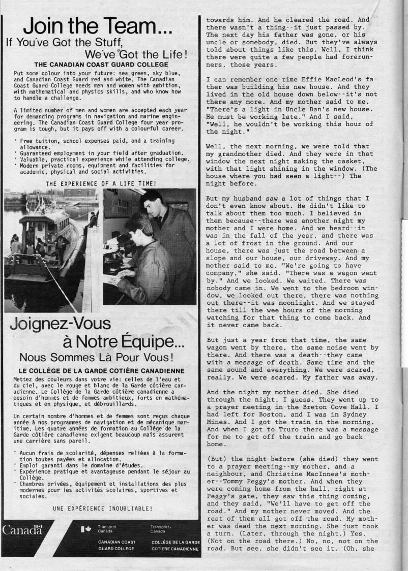 Published by Ronald Caplan on 1988/1/1 (191 reads)Join the Team... If You've Got the Stuff, We've Got the Life! THE CANADIAN COAST GUARD COLLEGE Put some colour into your future: sea green, sky blue, and Canadian Coast Guard red and white. The Canadian Coast Guard College needs men and women with ambition, with mathematical and physics skills, and who know how to handle a challenge. A limited number of men and women are accepted each year for demanding programs in navigation and marine engin? eering. The Canadian Coast Guard College four year pro? gram is tough, but it pays off with a colourful career. • Free tuition, school expenses paid, and a training allowance. • Guaranteed employment in your field after graduation. ' Valuable, practical experience while attending college. • Modern private rooms, equipment and facilities for academic, physical and social activities. THE EXPERIENCE OF A LIFE TIME! Joignez-Vous a Notre Equipe... Nous Sommes La Pour Vous! LE COLLEGE DE LA GARDE COTIERE CANADIENNE Mettez des couleurs dans votre vie: celles de I'eau et du ciel, avec le rouge et blanc de la Garde cotiere can? adienne. Le College de la Garde cotiere canadienne a besoin d'hommes et de femmes ambitieux, forts en math'ma- tiques et en physique, et d'brouillards. Un certain nombre d'hommes et de femmes sont rejus chaque annee ci nos programmes de navigation et de mecanique mar? itime. Les quatre ann??es de formation au College de la Garde c6tiere canadienne exigent beaucoup mais assurent une carriere sans pareil. • Aucun frais de scolarit', depenses reliees h la forma? tion toutes payees et allocation. • Emploi garanti dans le domaine d'Etudes. • Experience pratique et avantageuse pendant le sejour au ColUge. ?? Chambres privees, equipement et installations des plus modernes pour les activites scolaires, sportives et sociales. UNE EXPERIENCE INOUBLIABLE! towards him. And he cleared the road. And there wasn't a thing--it just passed by. The next day his father was gone, or his uncle or somebody, died. But they've always told about things like this. Well, I think there were quite a few people had forerun? ners , those years. I can remember one time Effie MacLeod's fa? ther was building his new house. And they lived in the old house down below--it's not there any more. And my mother said to me, "There's a light in Uncle Dan's new house. He must be working late." And I said, "Well, he wouldn't be working this hour of the night." Well, the next morning, we were told that my grandmother died. And they were in that window the next night making the casket, with that light shining in the window. (The house where you had seen a light--) The night before. But my husband saw a lot of things that I don't even know about. He didn't like to talk about them too much. I believed in them because--there was another night my mother and I were home. And we heard--it was in the fall of the year, and there was a lot of frost in the ground. And our house, there was just the road between a slope and our house, our driveway. And my mother said to me, "We're going to have company," she said. "There was a wagon went by." And we looked. We waited. There was nobody came in. We went to the bedroom win? dow, we looked out there, there was nothing out there--it was moonlight. And we stayed there till the wee hours of the morning watching for that thing to come back. And it never came back. But just a year from that time, the same wagon went by there, the same noise went by there. And there was a death--they came with a message of death. Same time and the same sound and everything. We were scared, really. We were scared. My father was away. And the night my mother died. She died through the night, I guess. They went up to a prayer meeting in the Breton Cove Hall. I had left for Boston, and I was in Sydney Mines. And I got the train in the morning. And when I got to Truro there was a message for me to get off the train and go back home. (But) the night before (she died) they went to a prayer meeting--my mother, and a neighbour, and Christine Maclnnes's moth? er- -Tommy Peggy's mother. And when they were coming home from the hall, right at Peggy's gate, they saw this thing coming, and they said, "We'll have to get off the road." And my mother never moved. And the rest of them all got off the road. My moth? er was dead the next morning. She just took a turn. (Later, through the night.) Yes. (Not on the road there.) No, no, not on the road. But see, she didn't see it. (Oh, she