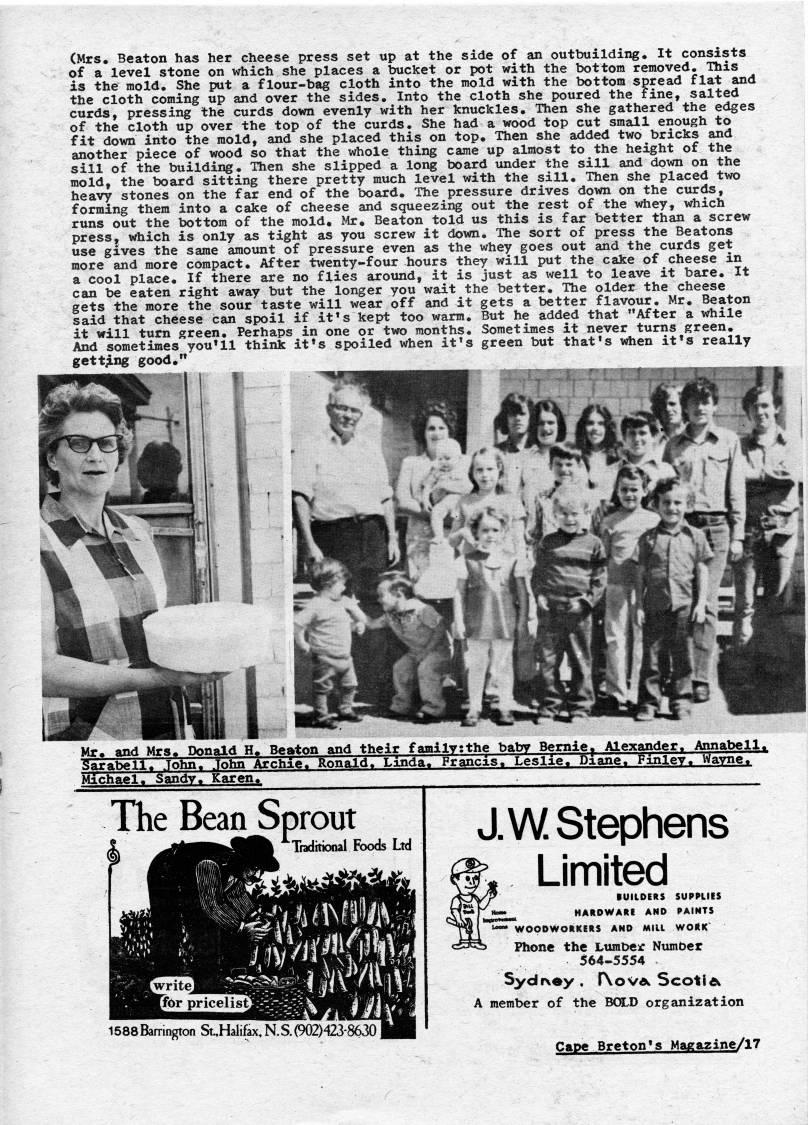 Published by Ronald Caplan on 1974/10/1 (898 reads)(Mrs. Beaton has her cheese press set up at the side of an outbuilding. It consists of a level stone on which she places a bucket or pot with the bottom removed. This is the mold. She put a flour-bag cloth into the mold with the bottom spread flat and the cloth coming up and over the sides. Into the cloth she poured the fine, salted curds, pressing the curds down evenly with her knuckles. Then she gathered the edges of the cloth up over the top of the curds. She had a wood top cut small enough to fit down into the mold, and she placed this on top. Then she added two bricks and another piece of wood so that the whole thing came up almost to the height of the sill of the building. Then she slipped a long board under the sill and down on the mold, the board sitting there pretty much level with the sill. Then she placed two heavy stones on the far end of the board. The pressure drives down on the curds, forming them into a cake of cheese and squeezing out the rest of the whey, which runs out the bottom of the mold. J4r. Beaton told us this is far better than a screw press, which is only as tight as you screw it down. The sort of press the Beatons use gives the same amount of pressure even as the whey goes out and the curds get more and more compact. After twenty-four hours they will put the cake of cheese in a cool place. If there are no flies around, it is just as well to leave it bare. It can be eaten right away but the longer you wait the better. The older the cheese gets the more the sour taste will wear off and it gets a better flavour. Mr. Beaton said that cheese can spoil if it's kept too warm. But he added that "After a while it will turn green. Perhaps in one or two months. Sometimes it never turns green. And sometimes you'll think it's spoiled when it's green but that's when it's really getti.ng good." Mr?? and Mrs, Donald H. Beaton and their familytthe baby Bemie| Alexander. Annabell. Sarabell. John. John Archie. Ronald. Linda. Francis. Leslie. Diane. Finley. Wayne. Michael. Sandy. Karen. Traditional Foods Ltd |write' por priceljj l588Barrington St.,HaIifax. N.S.(902)423-86301 J. W Stephens Limited ??uiiDERs supplies HARDWARi AND PAINTS WOODWORKERS AND Mill WORK Phone the Lumber Ntunber 564-5554 Sydrvey, fXova' Scotie' A member of the BOLD organization Cape Breton's Magazine/lT
